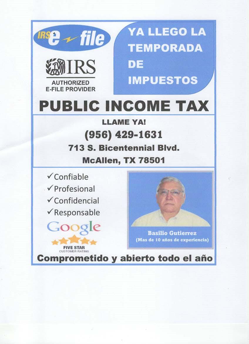 3 Miércoles 15 de Marzo 2023 fundado en 1986 COMUNIDAD YA LLEGO LA TEMPORADA DE Confiable Profesional Confidencial Atendido por: Basilio Gutierrez PUBLIC INCOME TAX ¡ 713 S. Bicentennial Blvd. McAllen, TX 78501 (956)429-1631 Comprometido y abierto todo el año Responsable FIVE STAR CUSTOMER RATING Lunes a Viernes 9:00 AM - 5:30 PM Sábado 9:00 AM - 3:00 PM