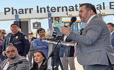 Pharr.- El director del Puente Internacional de Pharr, Luis Bazán, dio datos sobre las funciones y volúmenes de carga de ese cruce internacional, destacando que maneja el 65 por ciento de la producción nacional de México y facilita más de 47 mil millones de dólares en comercio anual. (Foto JLBgarza I-Phone)