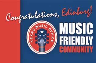 “Edinburg es conocida en el Valle del Río Grande como una joya cultural: desde el Museo de Historia del Sur de Texas hasta el Festival Internacional de Cine del Sur de Texas y el Museo de Motocicletas del Sur de Texas, siem pre hay algo culturalmente fascinante en marcha”, dijo el representante Bobby Guerra. “Ahora que Edinburg se ha ganado la prestigiosa designación de Music Friendly Com munity, la comunidad puede tallar otra faceta en la joya que es Edinburg. Como músico, conozco personalmente a los increíbles artistas de nuestra comunidad y estoy emo cionado de compartir su talento con el resto de Texas”. Edinburg se une a más de otras 30 ciudades de Texas que han recibido la designación oficial de “Music Friendly Community”, incluidas Abilene, Alpine, Arlington, Austin, Bastrop, Brenham, Bryan, Conroe, Dallas, Denison, Den ton, Dripping Springs, El Paso, Fort Worth, Grand Prairie, Harker Heights, Lindale, Lubbock, McAllen, McKinney, Na cogdoches, New Braunfels, Odessa, Port Aransas, Round Rock, Salado, San Angelo, San Antonio, San Marcos, Ste phenville, Victoria, Vidor, Waco, Waxahachie y Wimberley.