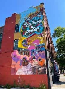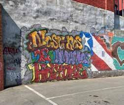 la Main, al frente de una iglesia con un perfil de clara mezcla de Renacimiento Griego y Bizancio. En la imagen habían dominós flotando, una negra envuelta en su traje blanco bailando al son de músicos tocando barriles de bomba, y referencias a Cayey, al Fiesta Café, a la bomba, la plena y la bachata. Ese mural me pareció extraordinario y pienso que la inscripción que lo adorna resume el espíritu y la esencia de las fiestas patronales de Holyoke, más allá de su comercialismo banal e inevitable. La inscripción dice, en cursivo, en letras blancas enmarcadas por trazos ondulantes en rojo y azul, “La cultura es poder”.