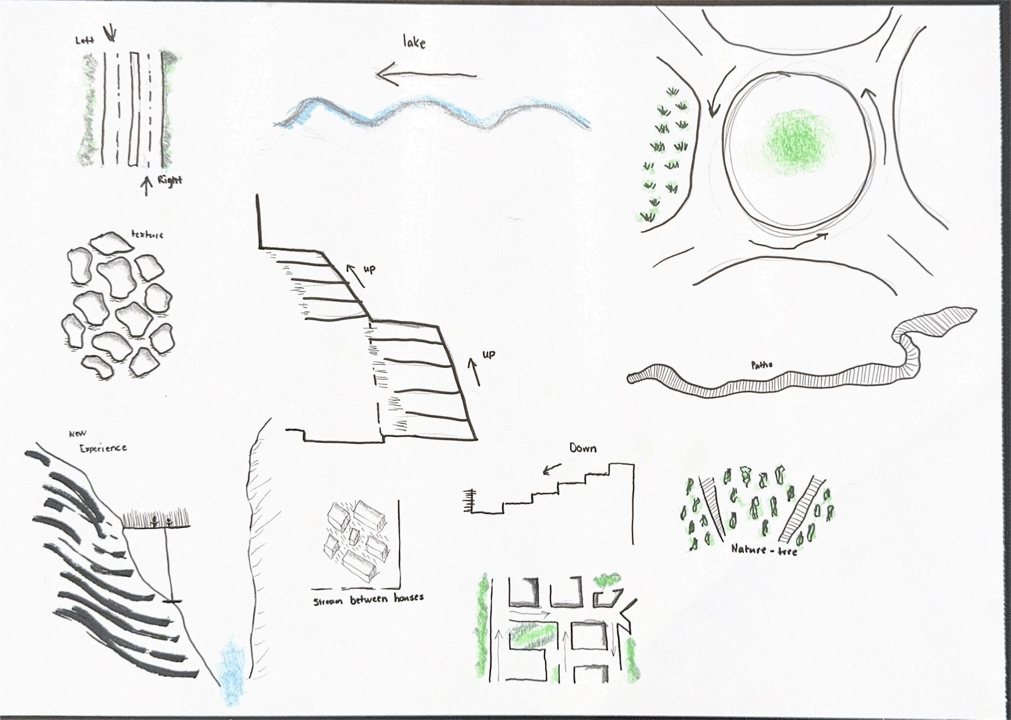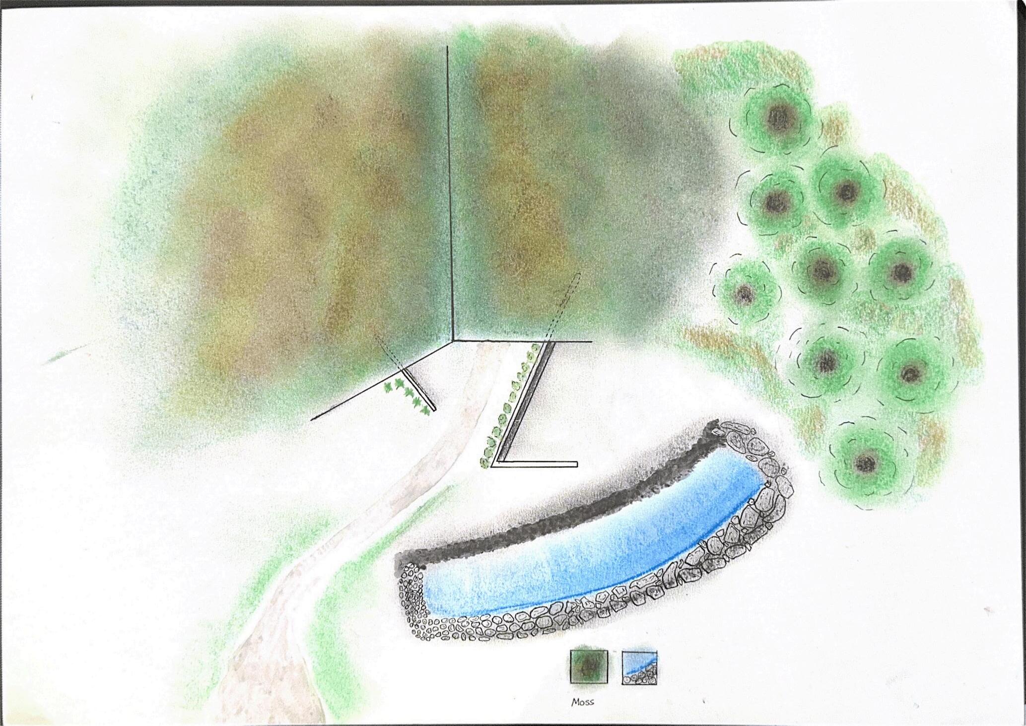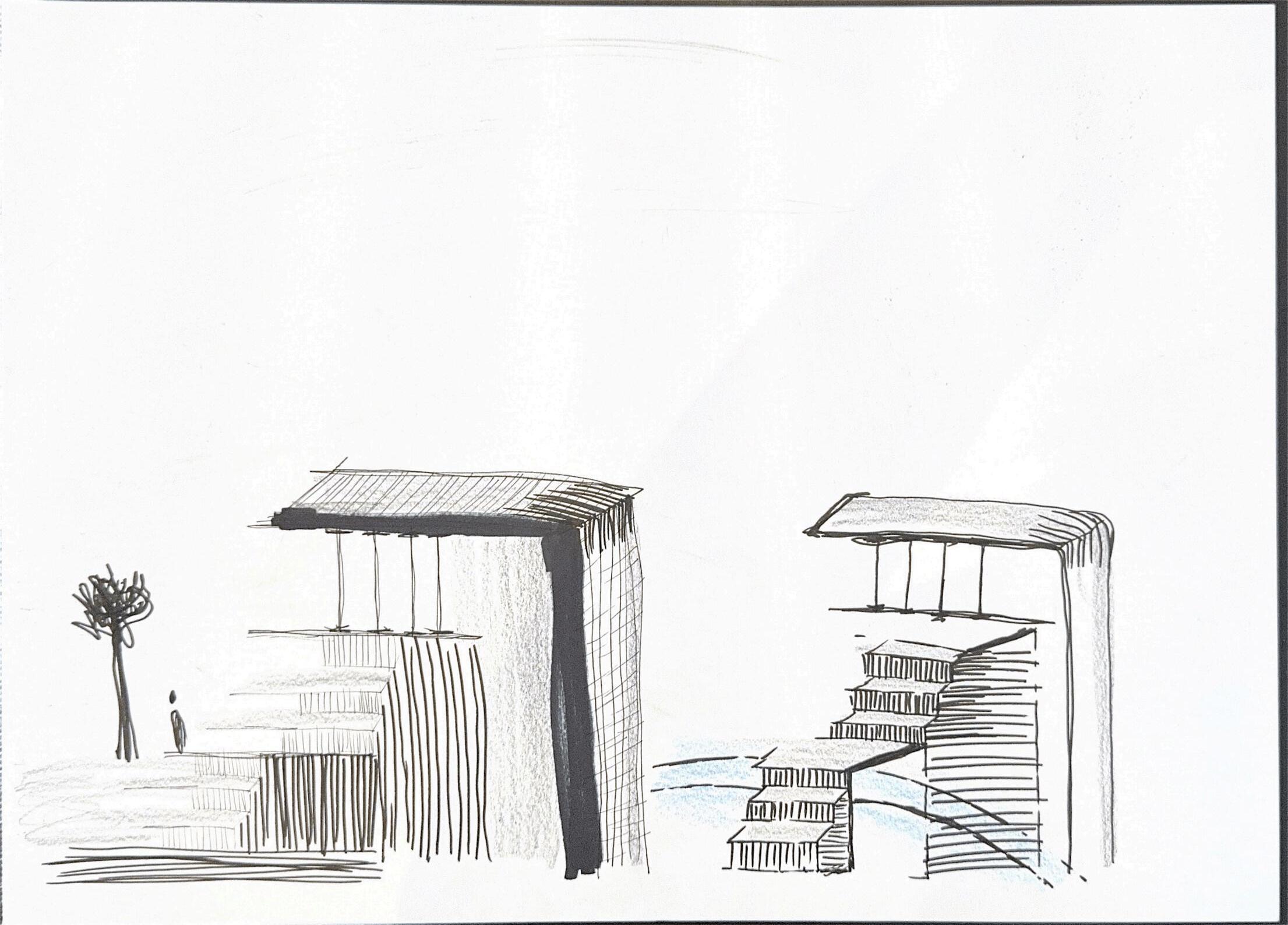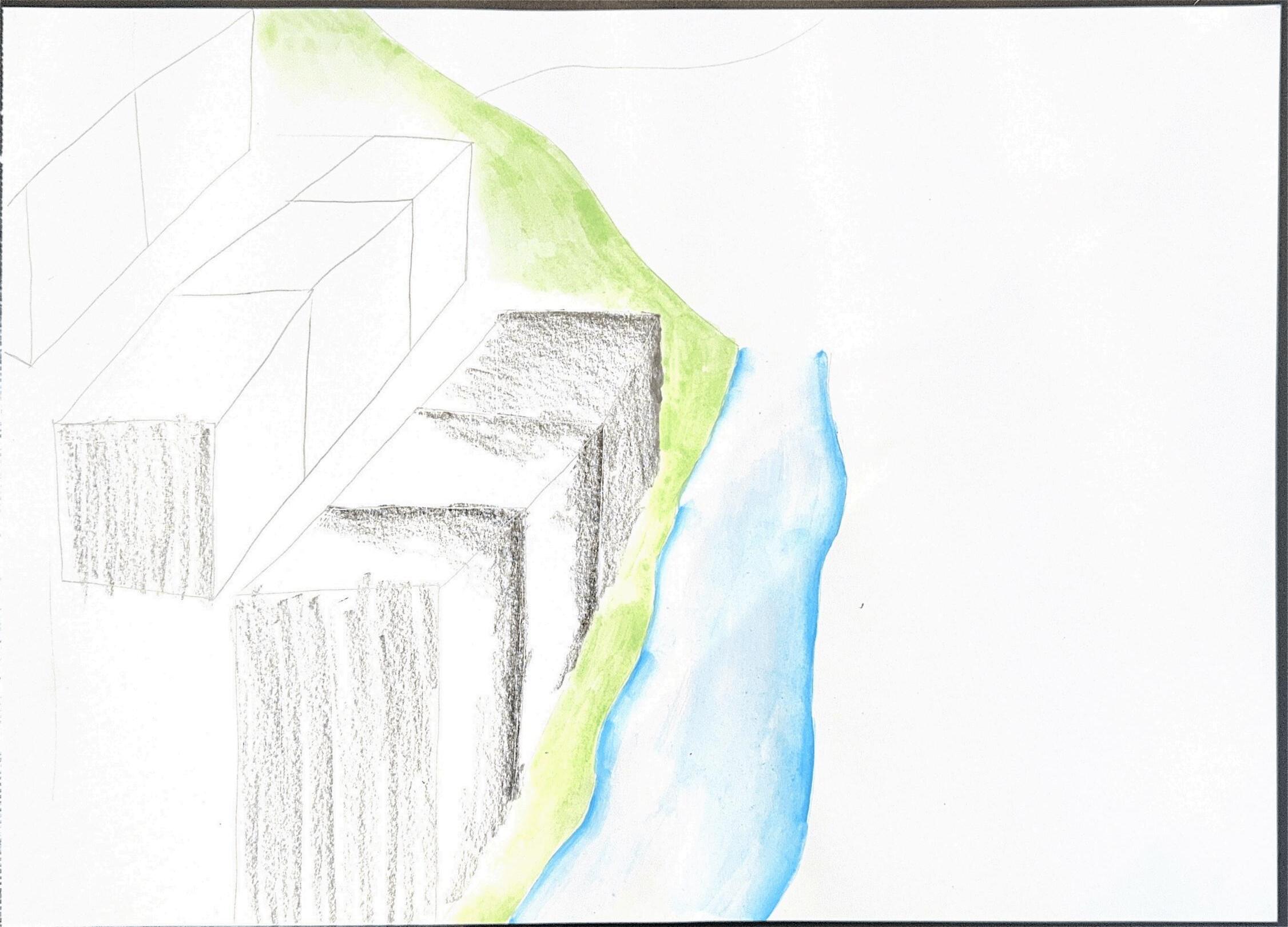 THE PROJECT BEGINS WITH A HAND DRAWN SKETCH. EXPLORING HOW THE BUILDING CAN BE EMBEDDED INTO THE LANDSCAPE. THE PLAN DEVELOPS THE IDEA OF STRUCTURE HIDDEN BENEATH A MOSS COVERED ROOF, BLENDING INTO THE SURROUNDING TERRAIN. THE FINAL COMPOSITION TRANSLATES THE CONCEPT INTO A DIGITAL DRAWING. BETWEEN BODY, LANDSCAPE, AND SPACE THROUGH SKETCHES, MODEL MAKING, AND DRAWINGS.