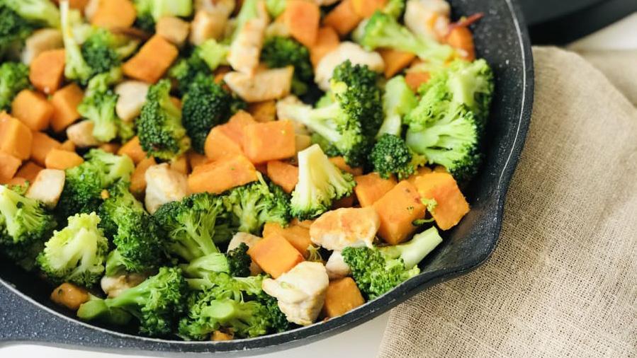 Vierte en la sartén la batata y el brócoli que tienes reservado, pon un poco de sal a todo, y saltea durante varios minutos hasta que los sabores se integren. ¡Listo