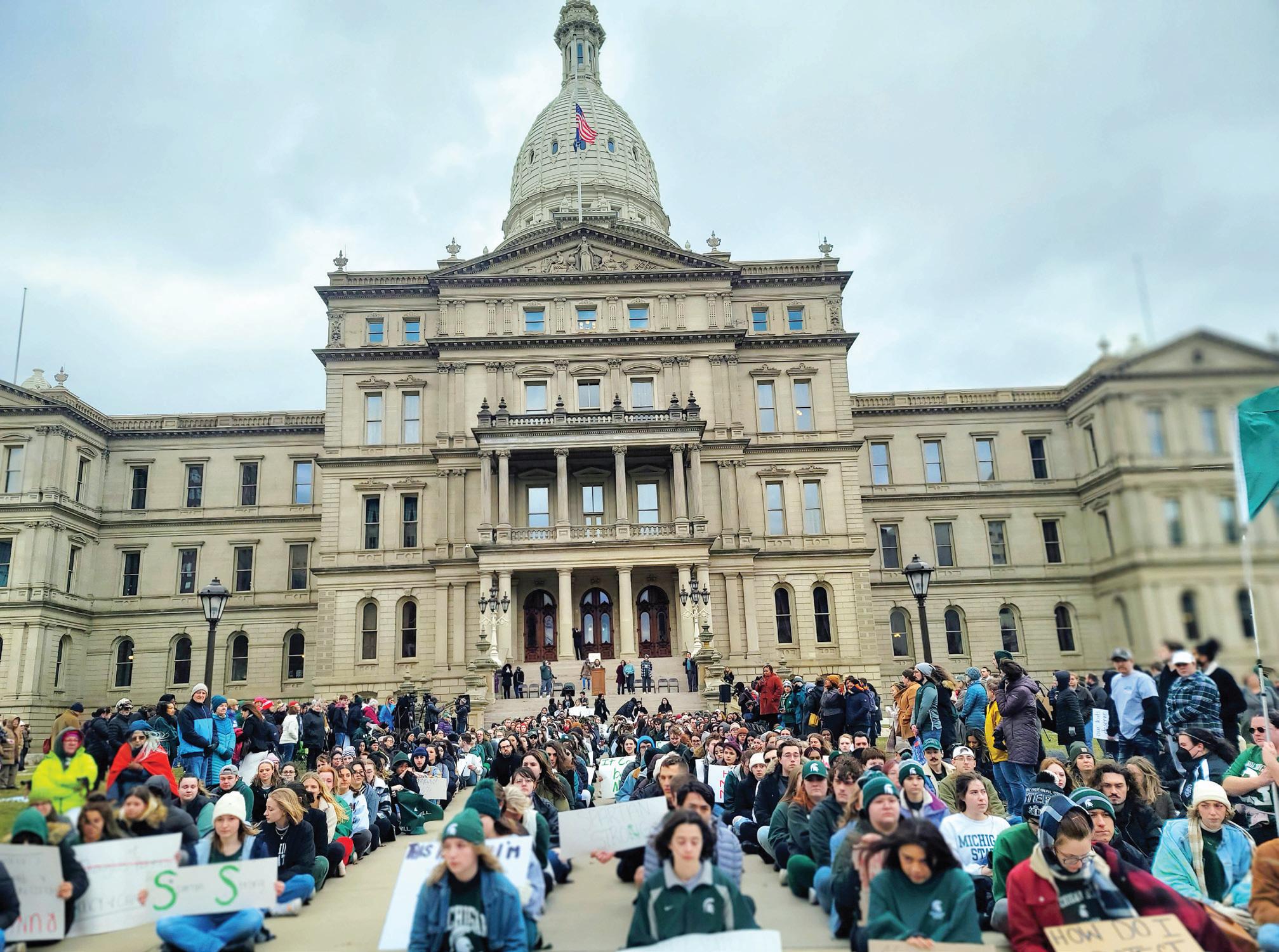 y más, llenaron los escalones del edificio del Capitolio de Lansing la tarde del miércoles 15 de febrero, para exigir a la legislatura una ley que regule el uso de armas en Michigan, después de que 3 estudiantes fueron asesinados y 5 fueron heridos de gravedad, en un tiroteo el 13 de febrero del 2023.