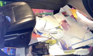 Se encontraron más de cien piezas de correo robado dentro del vehículo. Esto incluye múltiples tarjetas de crédito y débito, cheques y otro tipo de correspondencia.