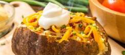 Cubre cada papa con 1/4 de taza de mezcla de carne molida; espolvorea cada una con queso cheddar rallado. Esparce la salsa en forma pareja en cada una y cubre con un poco de crema agria.