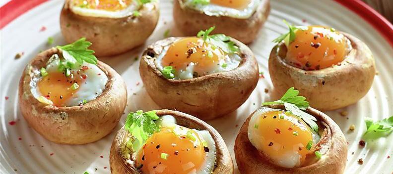 • Ponlos en un recipiente apto para el horno. Rellena los champiñones con la mezcla anterior. Corta la parte superior de los huevos de codorniz con un cuchillo de sierra y coloca uno sobre cada champiñón. Sazona y hornéalos a 400º F durante 2 minutos. Retira y muele encima un poco de pimienta negra.