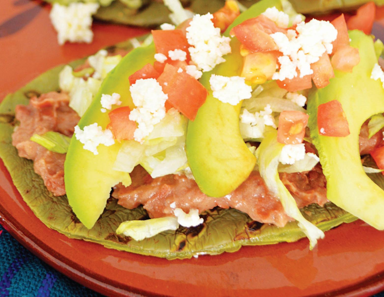 Cuando estén cocidos cubre con los frijoles y decora con lechuga, tomate, crema, aguacate, queso fresco y salsa.
