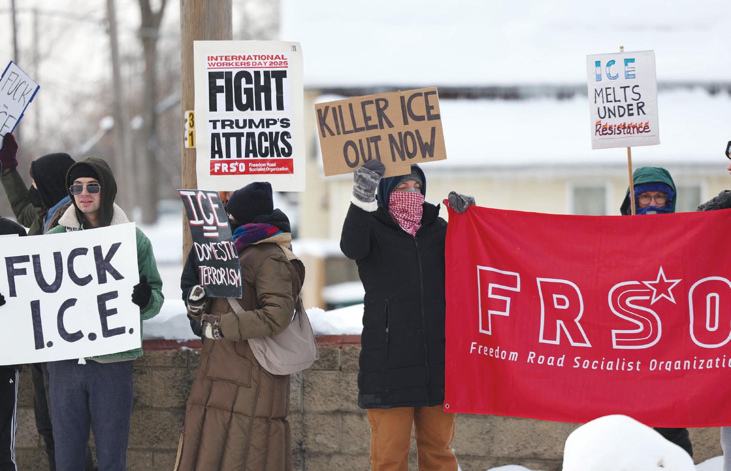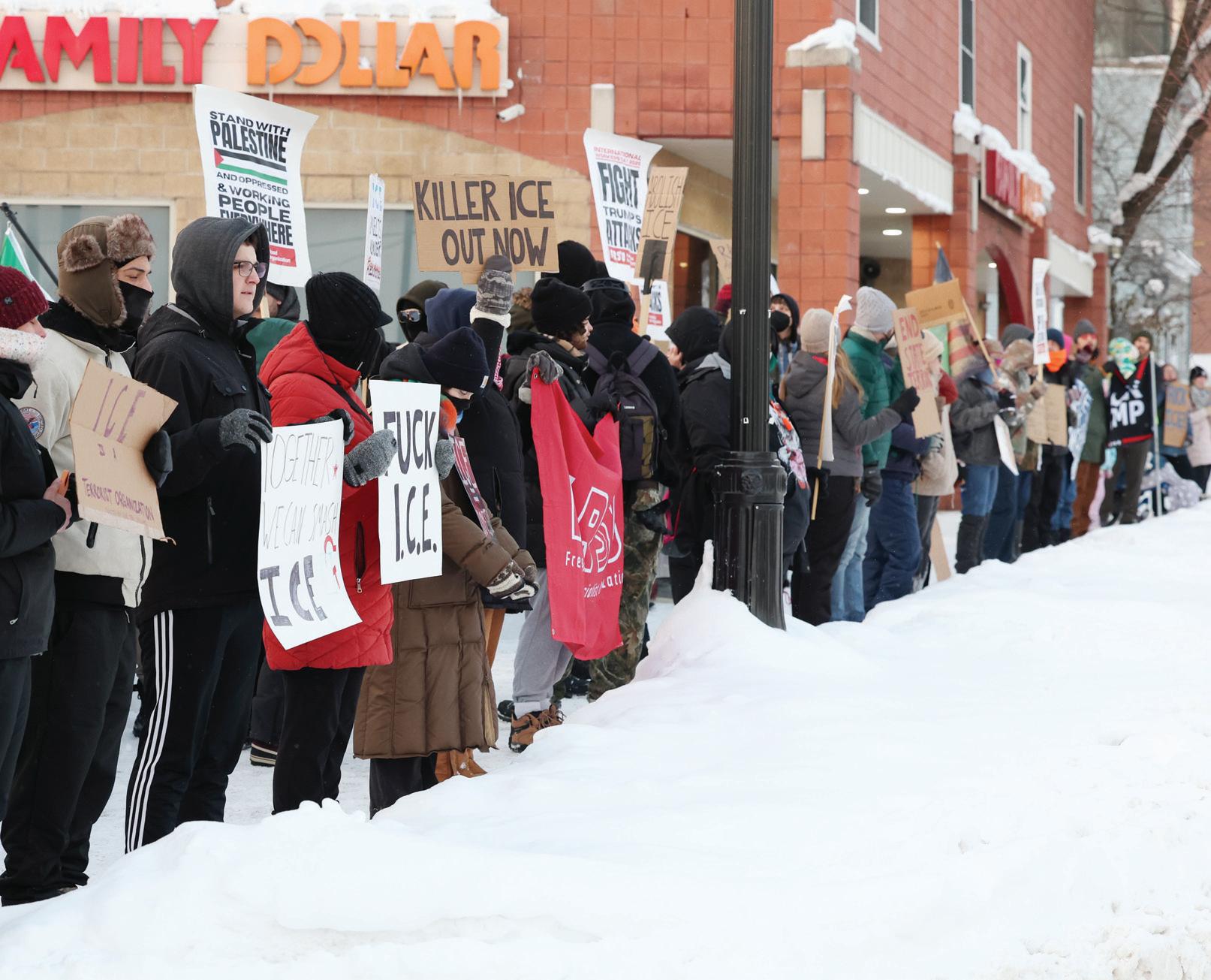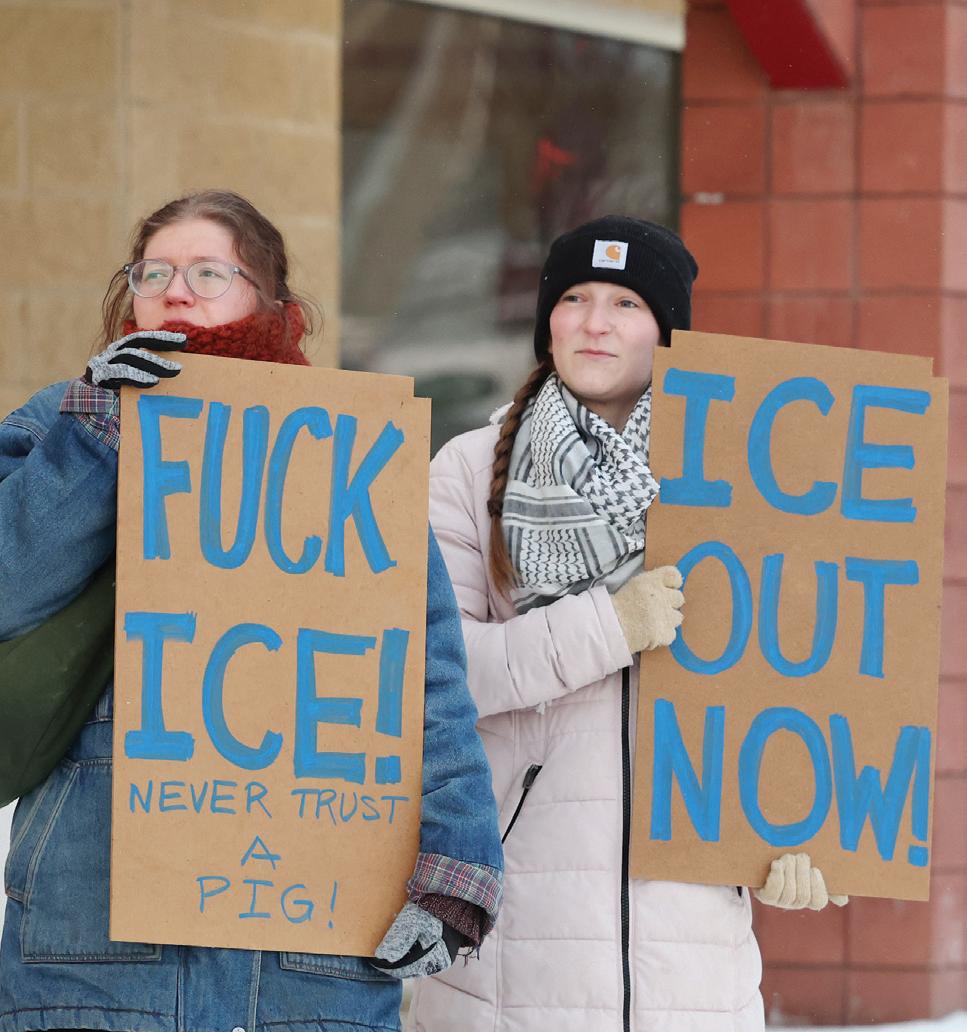Manifestantes en Grand Rapids levantaron carteles y gritaron consignas contra la presencia de más de 2.000 oficiales federales en Minnesota, pidiendo que el gobierno federal retire sus agentes de ese estado. (Andrés Abreu/ EVH)