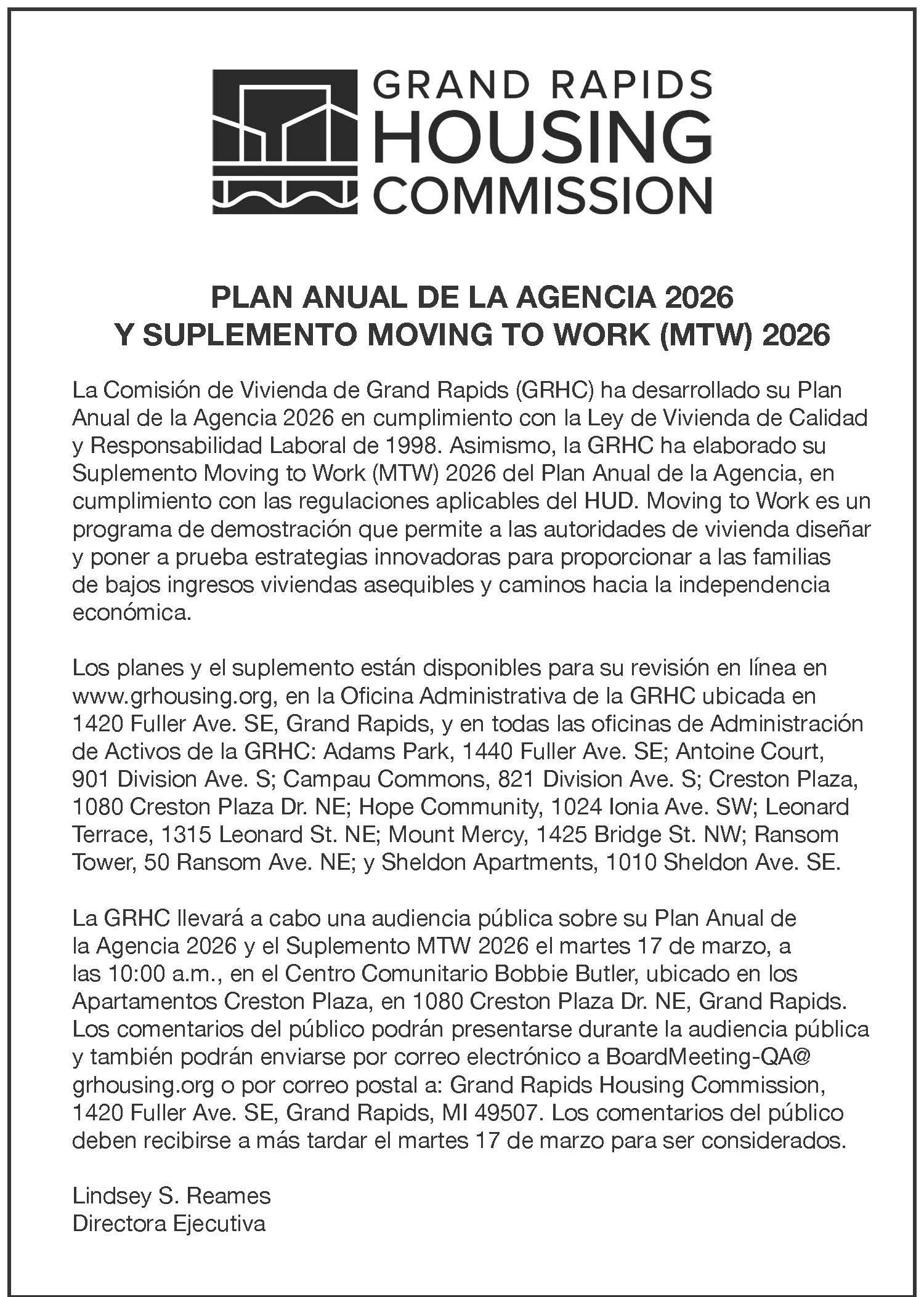 Cualquier persona que no esté de acuerdo con la evaluación de su propiedad puede presentar objeciones por escrito dirigiéndose a: City Assessor, Room 340, City Hall, 300 Monroe Avenue NW, Grand Rapids, Michigan 49503. Dichas objeciones deben ser específicas y presentarse por escrito ante el Asesor entre el 2 y el 13 de febrero de 2026. Los propietarios pueden apelar por correo electrónico a assessorgr@grcity.us Todas las apelaciones deben recibirse en la Oficina del Asesor antes de las 5:00 p. m. del 13 de febrero. No habrá excepciones a este plazo.