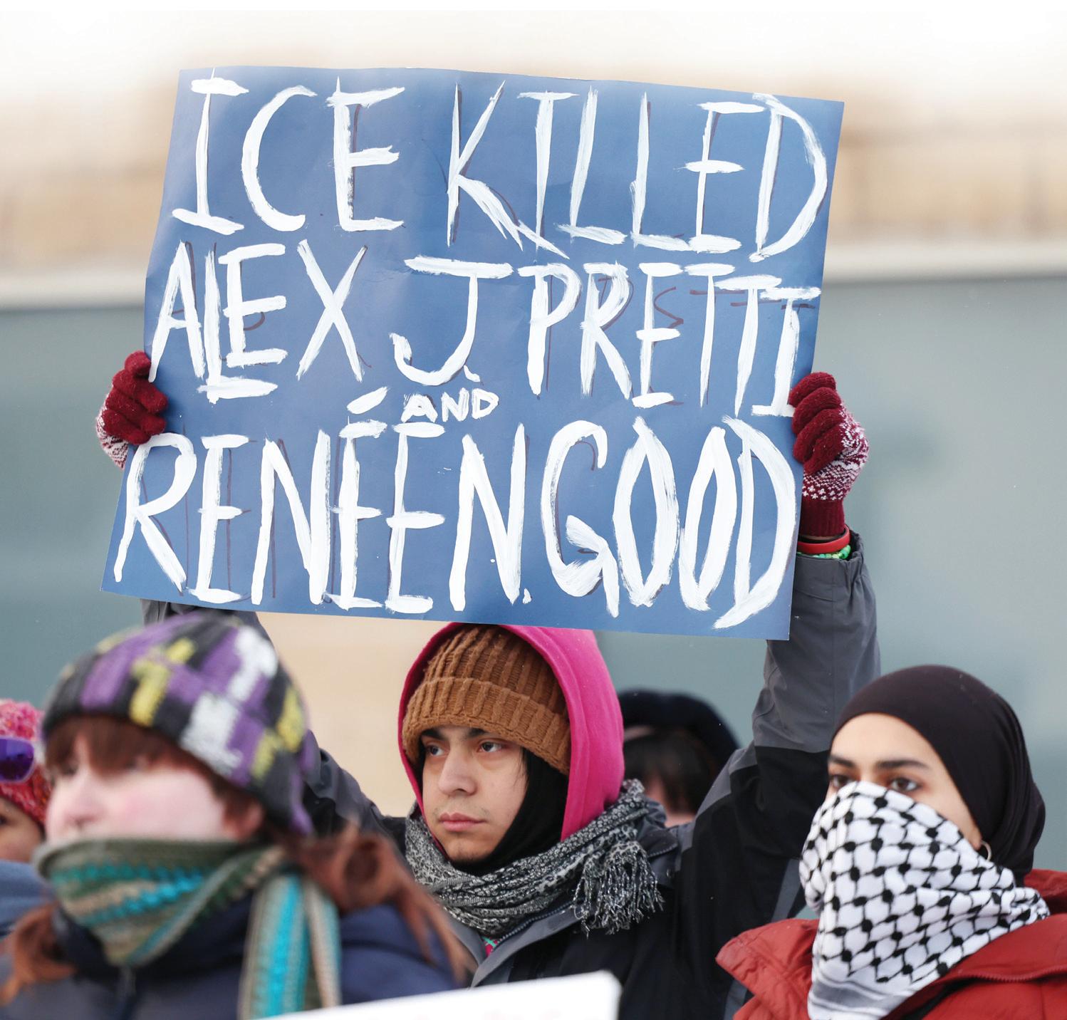 Manifestantes se reunieron el domingo 25 de enero a las 5:00 pm en la avenida César Chávez en Grand Rapids para protestar por la muerte de Alex Pretti, así como por el asesinato de Renne Good, y exigir justicia por los crímenes de los agentes federales. (Andrés Abreu/ EVH)
