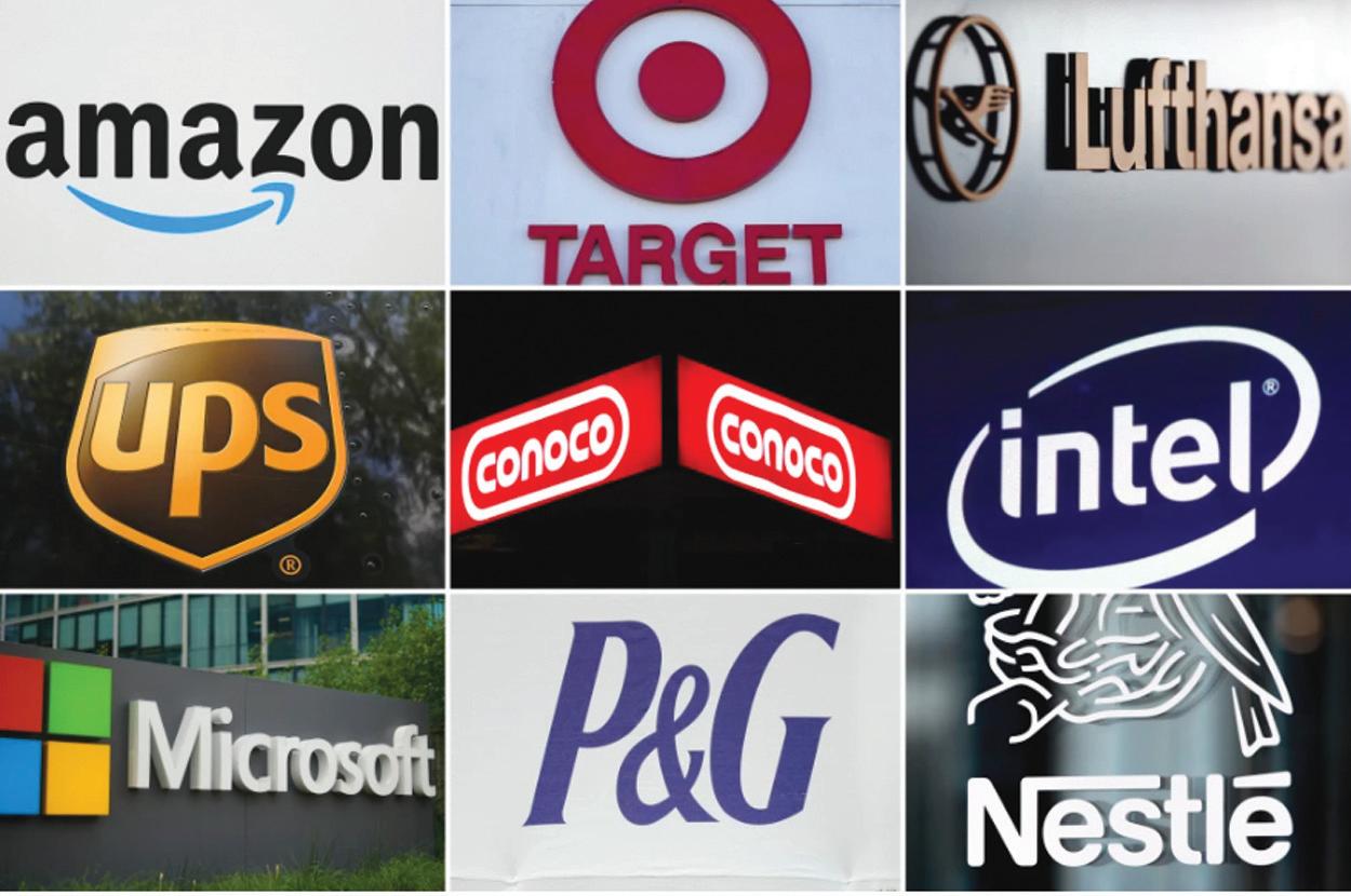 Combinación de fotos de los logos de las empresas Amazon, Target, Lufthansa Group, UPS, ConocoPhillips, Intel, Microsoft, Procter & Gamble y Nestle. (AP Foto, archivo)