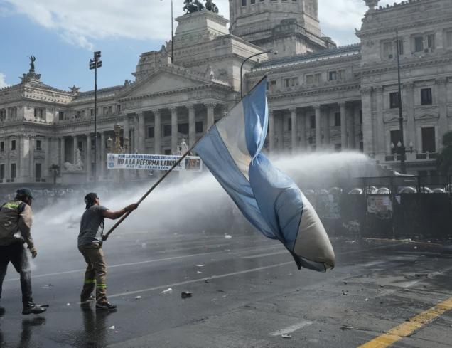 Miles de personas movilizadas por los influyentes sindicatos y partidos de oposición llenaron el miércoles una plaza céntrica de Buenos Aires, donde cortaron el tráfico y chocaron con la policía mientras continuaba la larga sesión parlamentaria. Al menos 15 personas fueron detenidas.