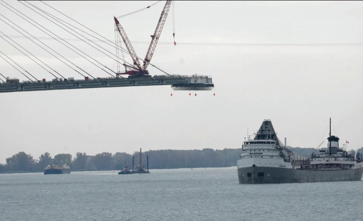 ARCHIVO – El barco Saginaw pasa frente a la construcción del Puente Internacional Gordie Howe, que pasa sobre el río Detroit y une Windsor, Ontario, con Detroit, el 25 de octubre de 2023. (AP Foto/Paul Sancya, Archivo)