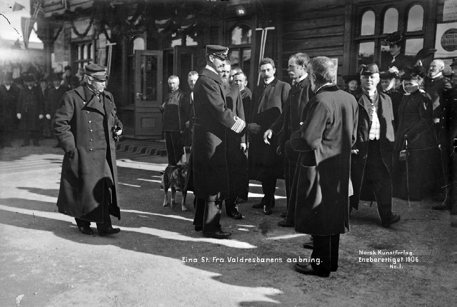 Kong Haakon VII åpner Valdresbanen, Eina jernbanestasjon i Veste Toten 1906. Foto: Georg Kjellerød / Østfold fylkes billedarkiv
