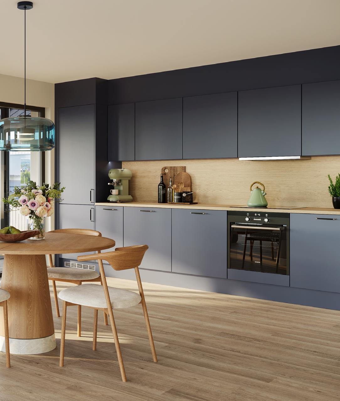I “Fjorden” tar vi Einafjorden inn og lar de herlige blåtonene få være kontrasten til den rolige basen vi finner i vannkanten og refleksjonene fra himmelen. En dempet base i beige toner passer godt mot det dype blå og varmen fra eikegulvene. Den generelle veggfargen er en sandfarget tone som oppleves lun og behagelig. Kjøkkenet i mørk blå farge gir karakter og står i kontrast til de lysere veggene.