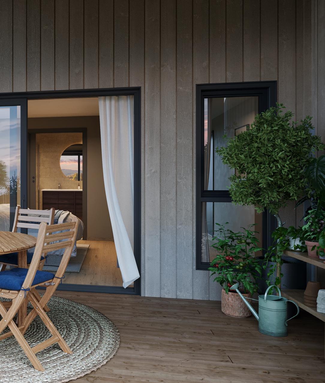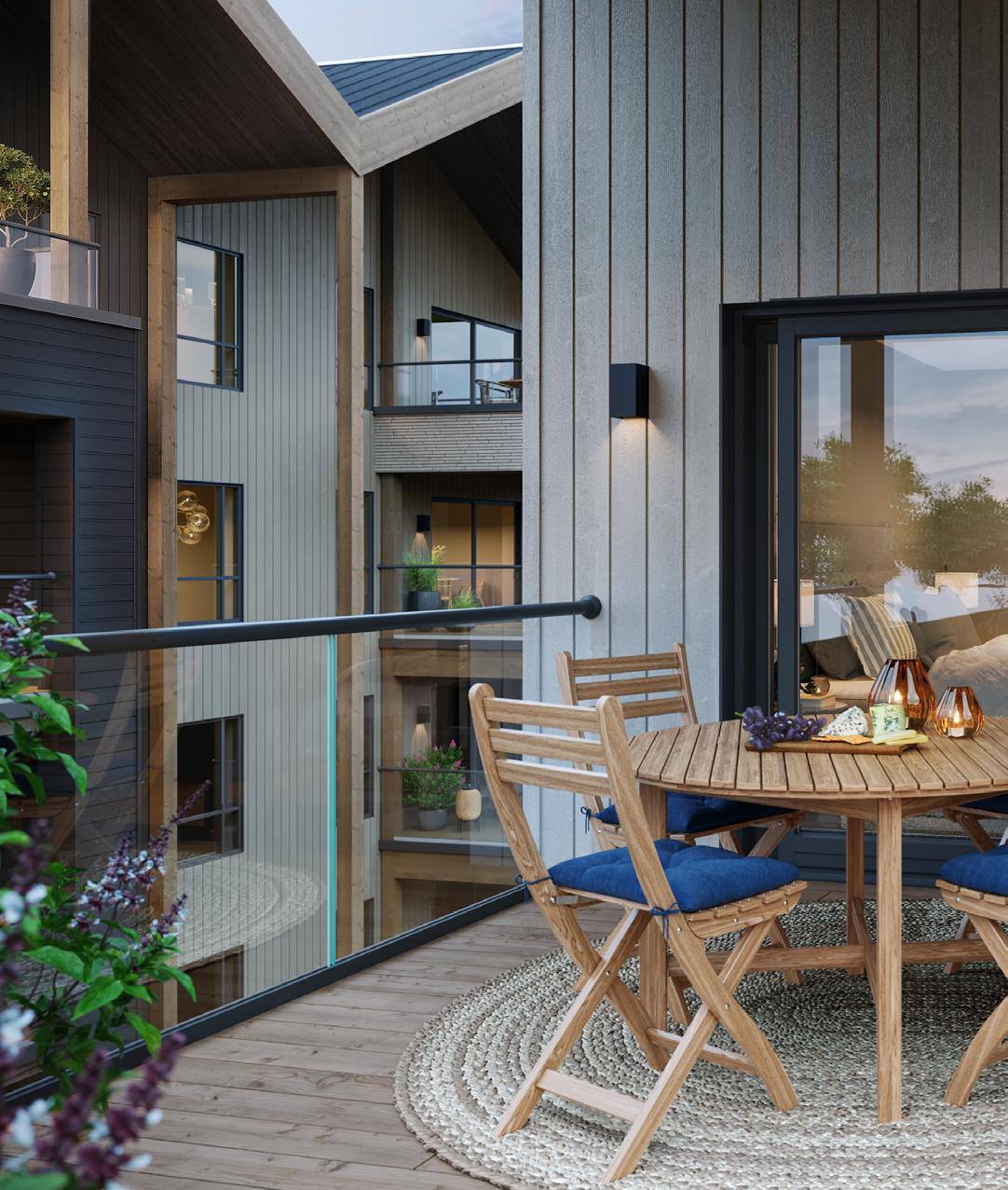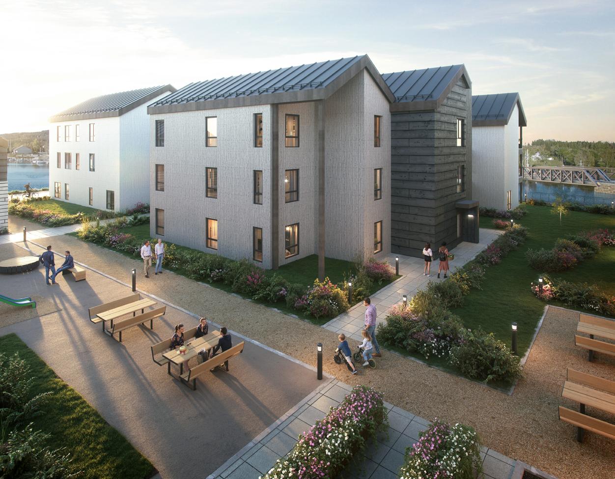 • Utendørs blir det hyggelige fellesområder, grøntanlegg og brygge, med tiltenkt badstue