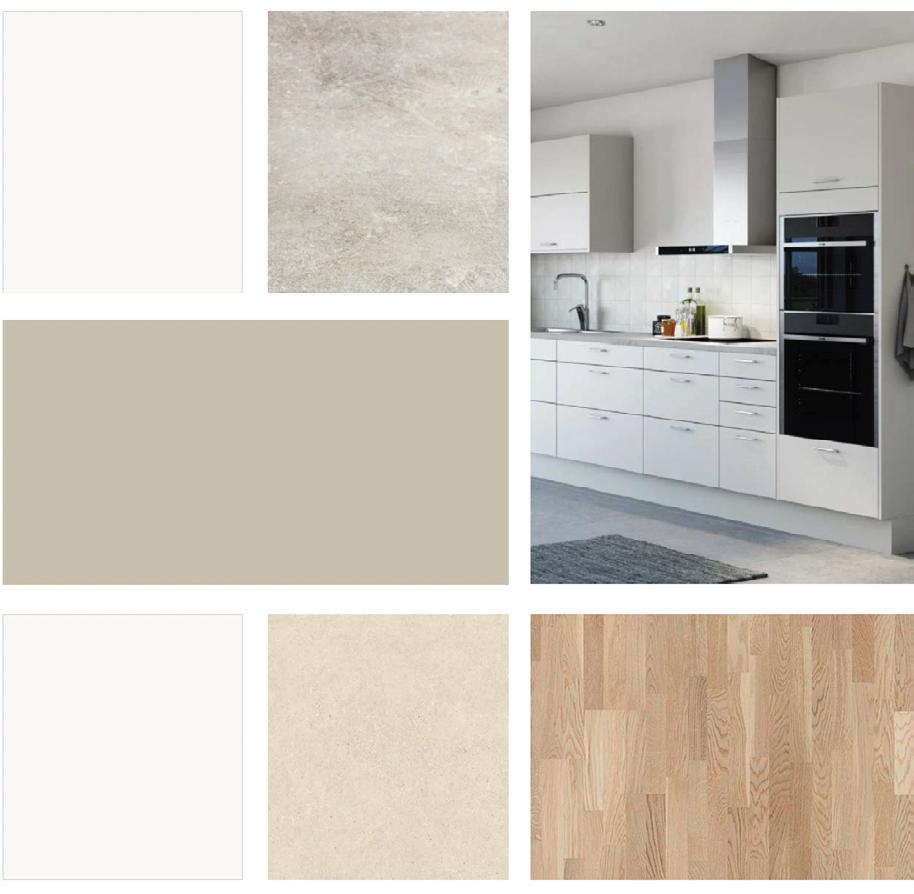 Den generelle veggfargen er lun og varm. Kjøkkenet går ton-i-ton med benkeplate i lys beige utførelse, og harmonerer med de varme veggene og eikegulv. Badene har fliser med naturmønster i lys farge og innredning i eik.