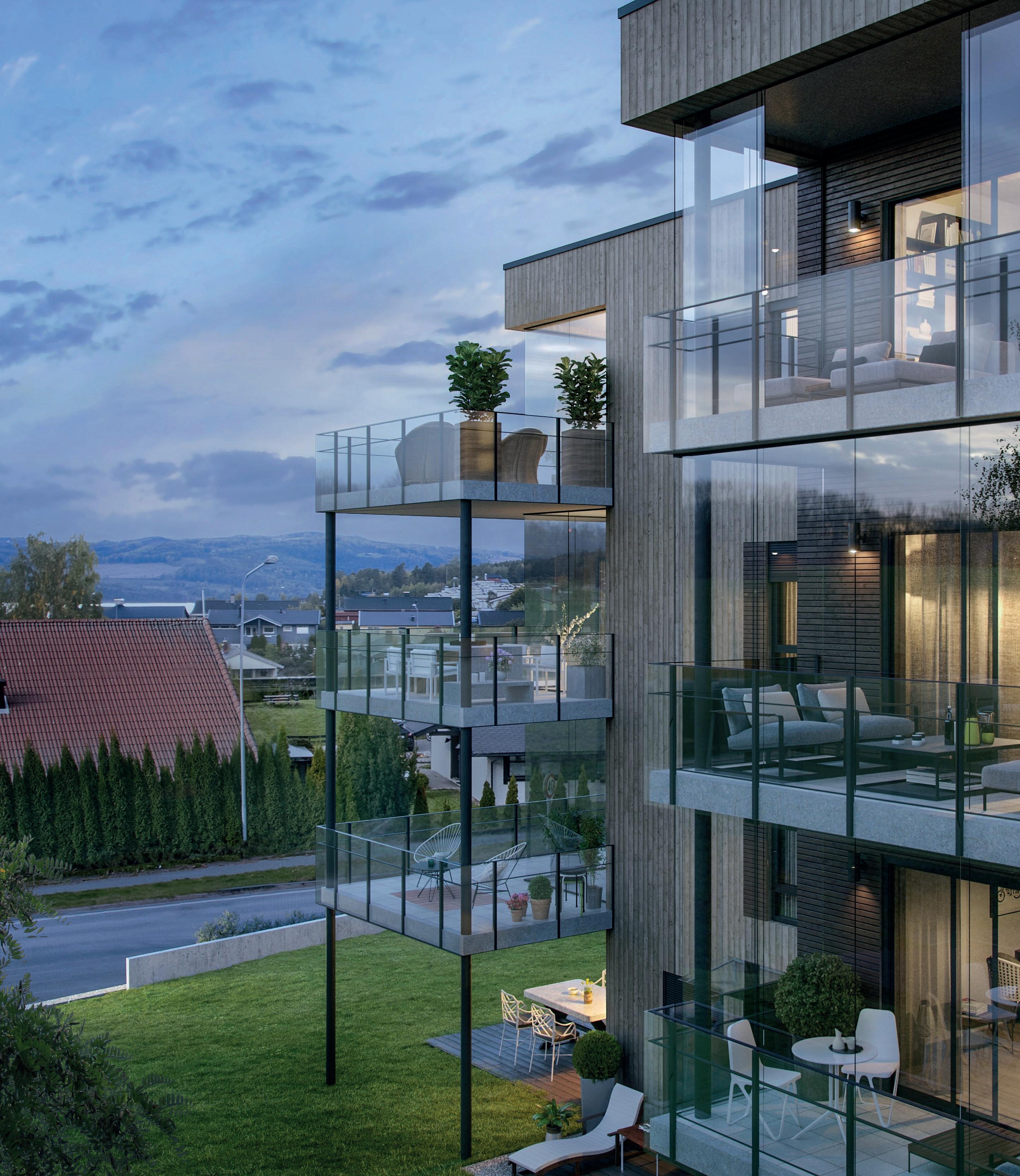Leilighetene har generøse balkonger og markterrasser som oppleves som fine forlengelser av leilighetene – og som gir muligheter. Med en varmelampe eller to kan du forlenge sesongen utendørs, og på den måten blir balkong og terrasse som et ekstra rom i boligen. De fleste leilighetene får delvis innglasset balkong som forlenger utesesongen både vår og høst. Innglassing kan åpnes og lukkes etter behov, med unntak av enkelte faste felt på enkelte balkonger.