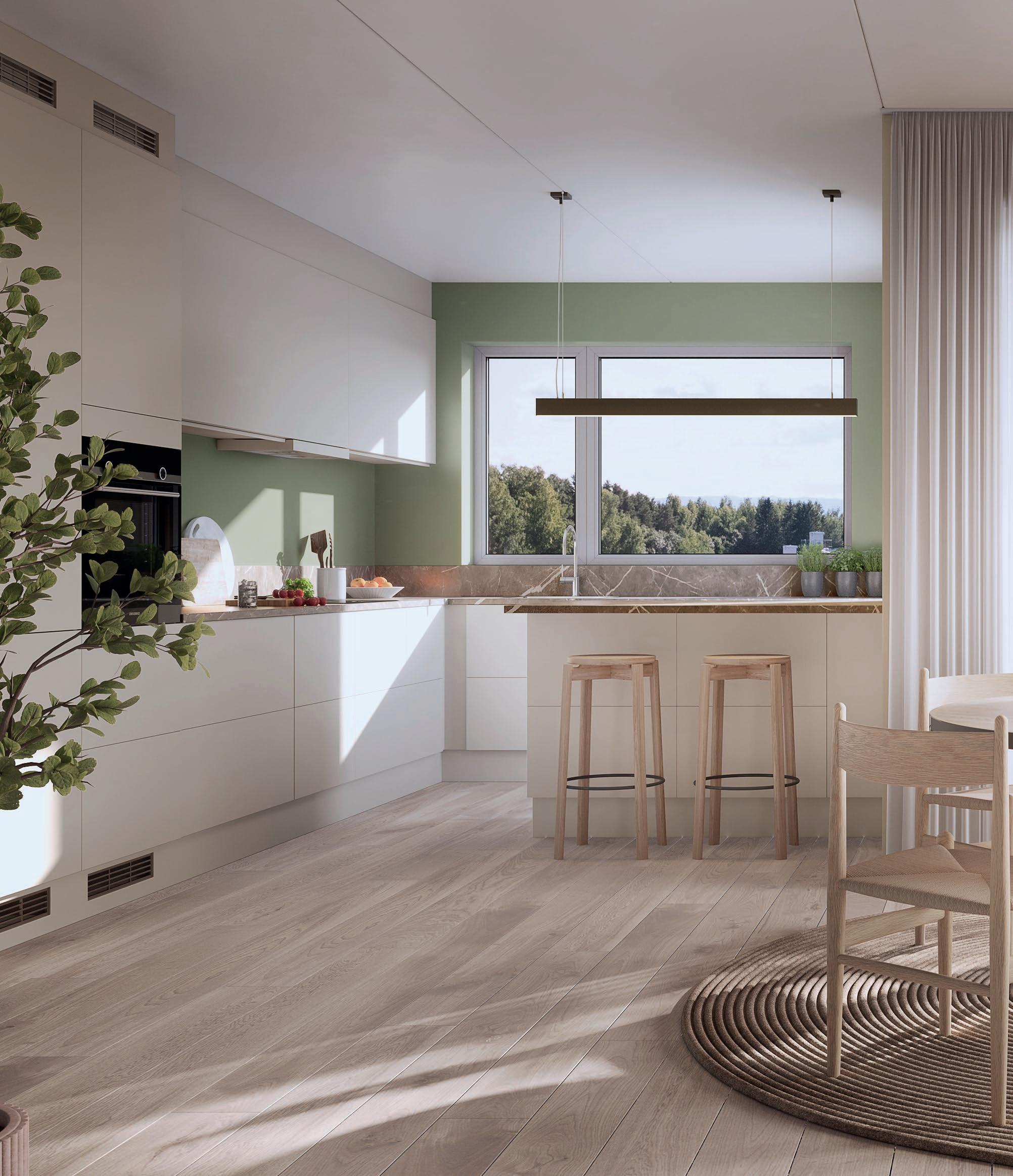 Har du gått barbeint på parkettgulv med varme? Kornhavens leiligheter får en-stavs lys eikeparkett – et vakkert og slitesterkt gulv – med vannbåren varme. Dette gjør at du kan møblere stua uten å måtte tenke på klumpete radiatorer under vinduene.
