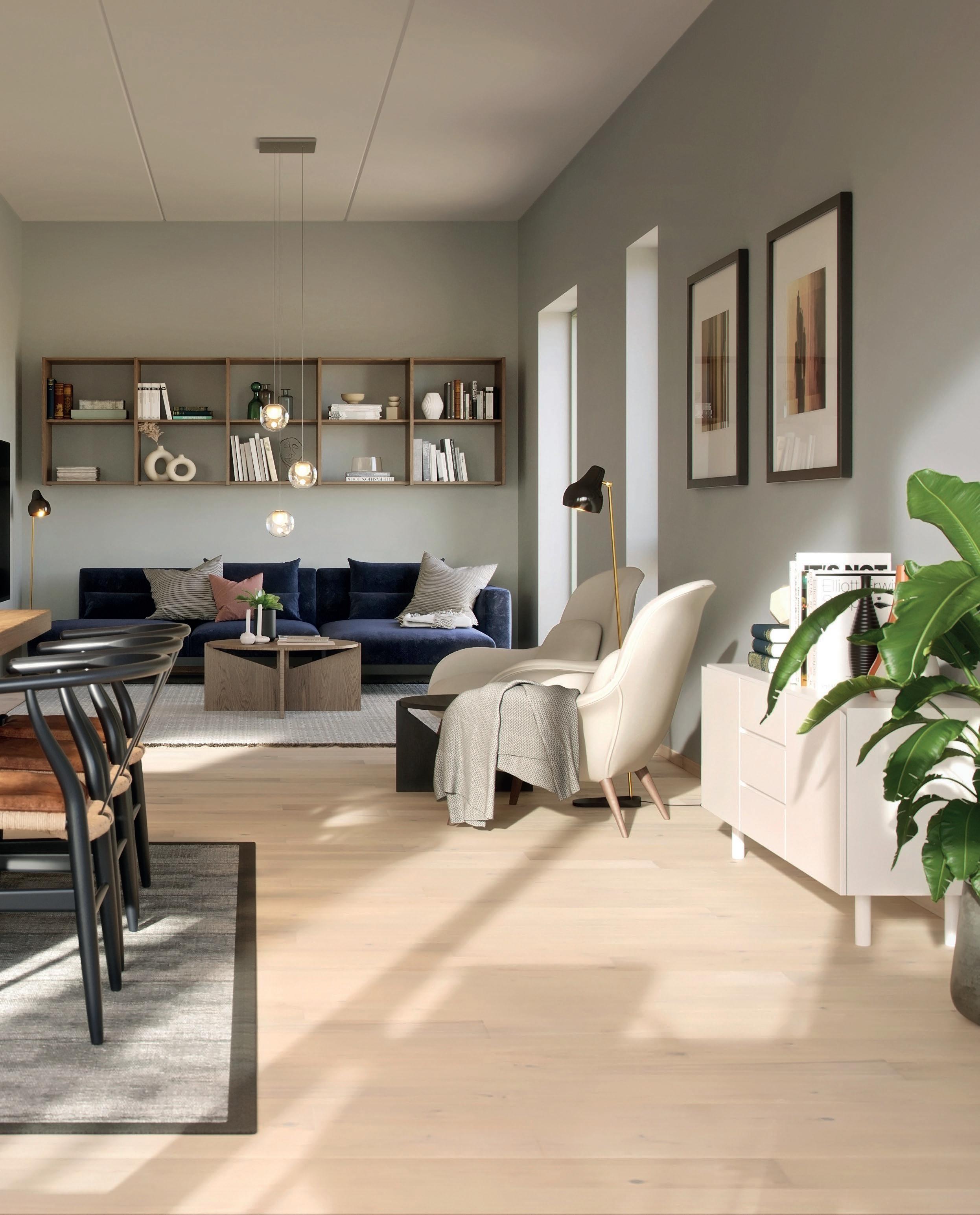 Gulv leveres med en mattlakkert 1- stavs eikeparkett og eikelister.