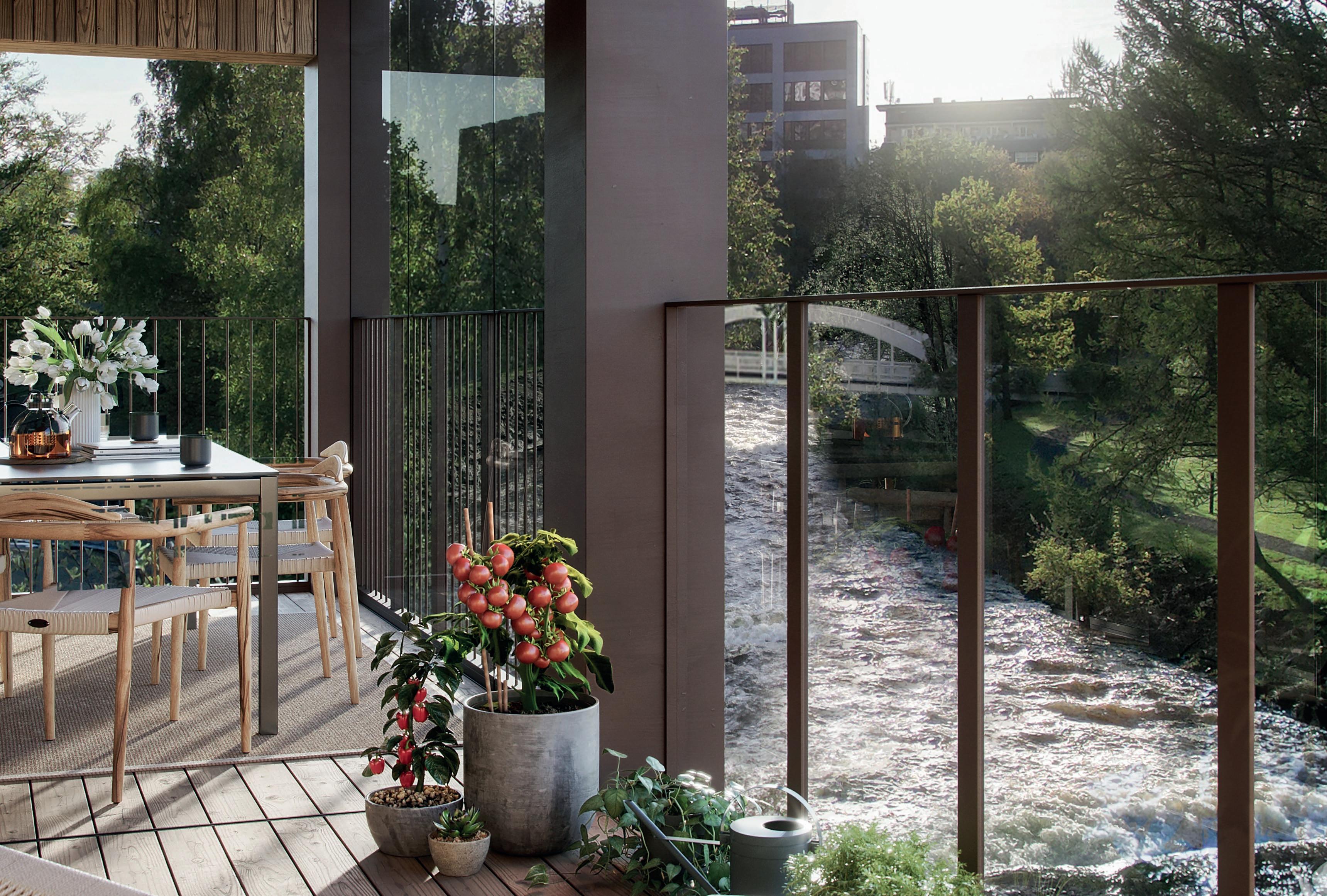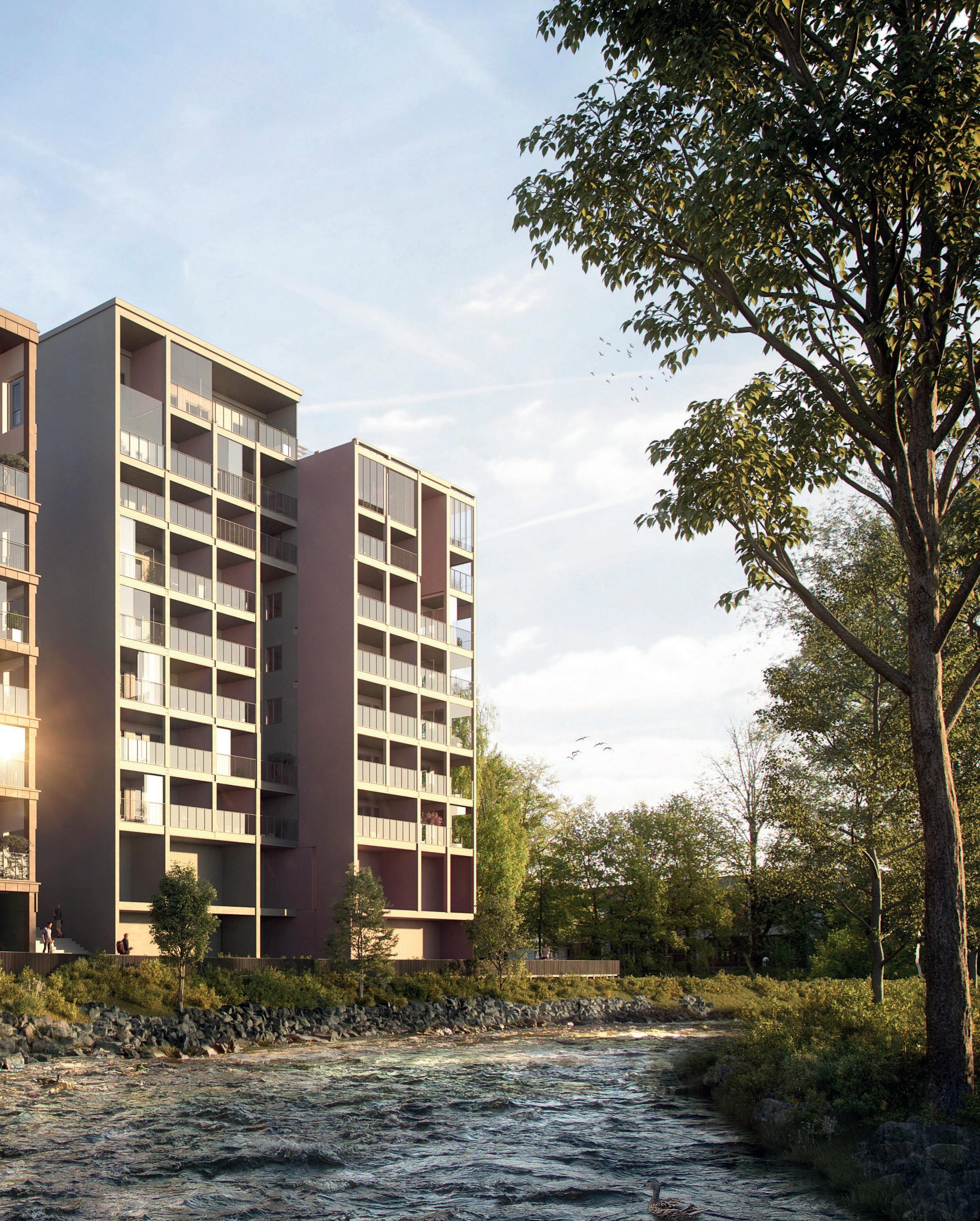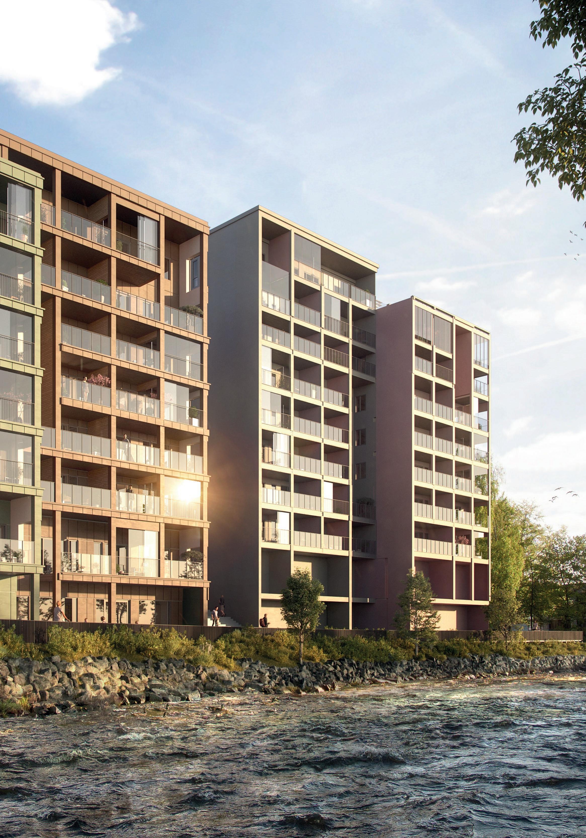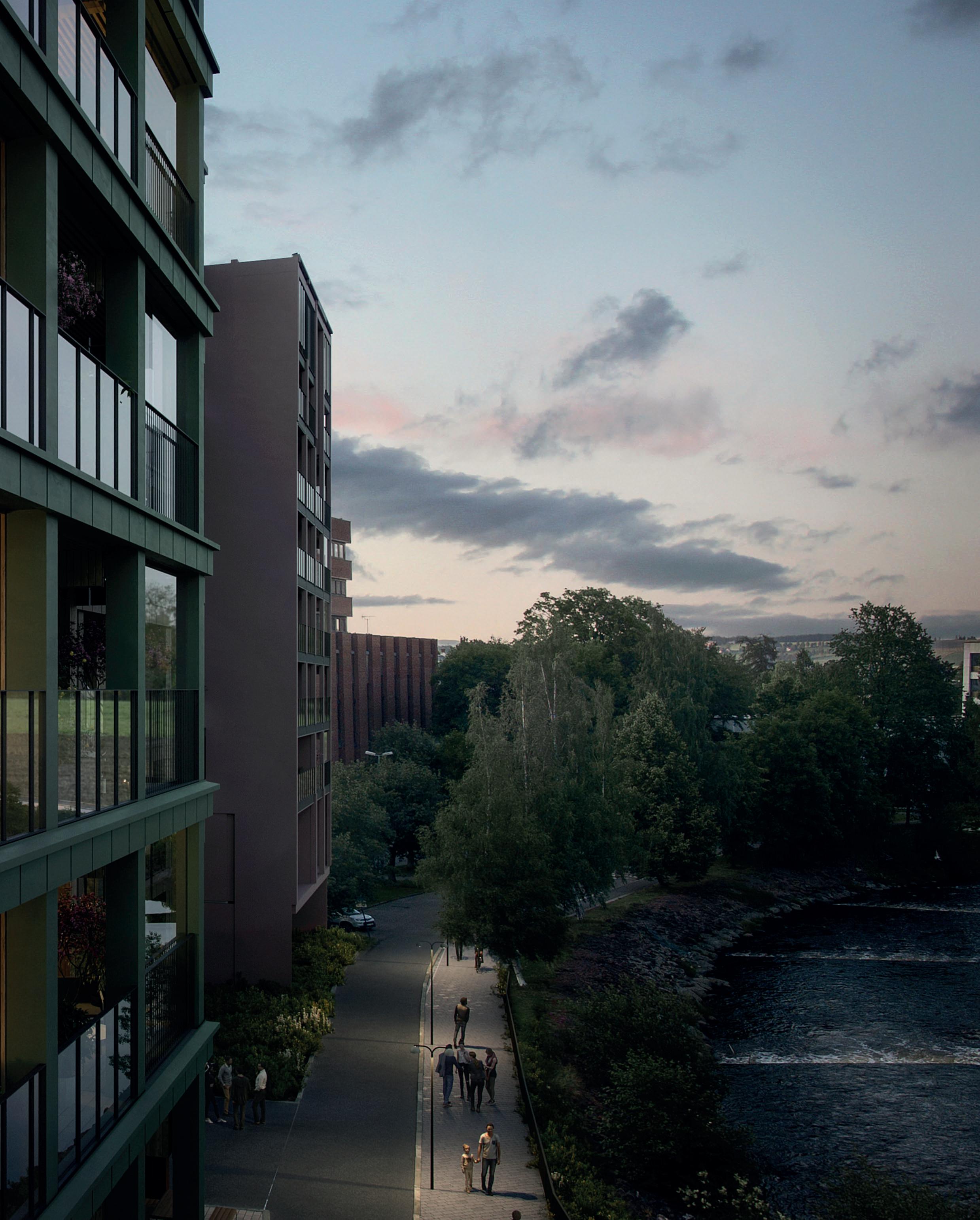 I Farverikvartalet får du muligheten til å bo midt i sentrum med elva sildrene forbi og med utsikt mot Gjøvik gård, vakre levende trær og et stort grøntareal. Her blir det masse luft og lys.