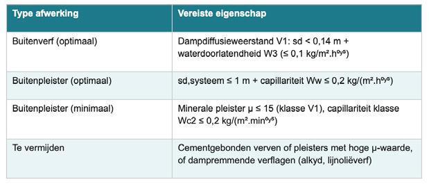 Kies bij voorkeur voor een verfsysteem met een goede waterdoorlatendheid (W3) en een lage dampdiffusieweerstand (V1). Niet alle verfsoorten zijn geschikt voor gevels met binnenisolatie. De keuze hangt af van de gewenste verhouding tussen waterdichtheid en dampdoorlatendheid.