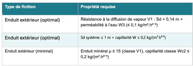 Ces enduits limitent l’absorption d’eau de pluie sans compromettre la capacité de séchage. Pour une explication plus détaillée des enduits offrant une protection minimale ou optimale, nous renvoyons au chapitre 3 de la NIT ainsi qu’au tableau correspondant.