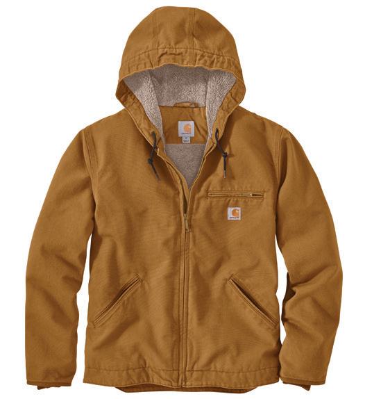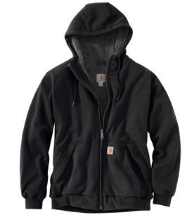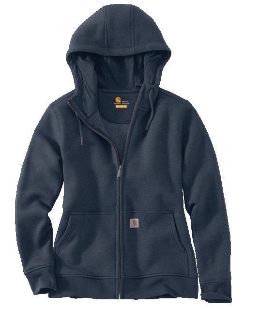 Three-piece hood with draw cord closure • Two front hand warmer pockets • Full-length front zipper • Stretchable, elastane reinforced rib knit cuffs and waistband • Carhartt label sewn on pocket • 10.5 oz/yd² - 357 gsm • Clarksburg Fleece • 55% Cotton / 45% Polyester
