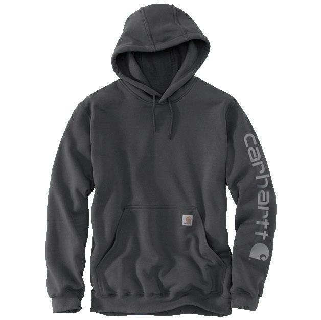 • Front hand warmer pockets with hidden media pocket • Stretchable, elastane reinforced rib knit cuffs and waistband • Carhartt "C Logo" soft hand plastisol graphic print on front and "Logo" graphic print on left sleeve • 10.5 oz/yd² - 357 gsm • Clarksburg Fleece • 55% Cotton / 45% Polyester