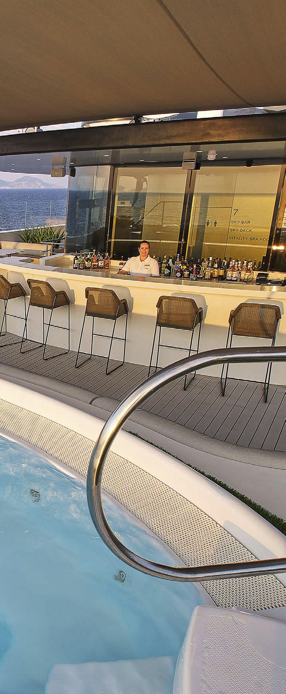 With its new indoor-outdoor space, the Sky Bar & Lounge – located on the top deck – serves your favourite cocktails, while the sun-kissed Aqua Pool & Café offers light meals, gelato and refreshments to re-energise you after your swim. Following your water sports adventures at the Marina Platform, dry off and relax at the Marina Lounge.