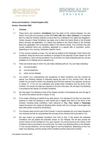 These terms and conditions (Conditions) form the basis of the contract between You and Scenic Tours (UK) Ltd (company number 05770868) (We, Us or Our) (Contract). It is important that You read the Contract carefully to ensure that You understand Your rights and obligations. Certain clauses in these Conditions may apply only to either the Scenic Brand or the Emerald Brand Journeys (as applicable). If a clause only applies to the Scenic Brand or the Emerald Brand (as applicable), this is expressly stated in the relevant clause. Your Contract may also include additional terms and conditions applicable to a special offer or promotion, and/or, depending on Your Journey, Destination Specific Terms.