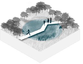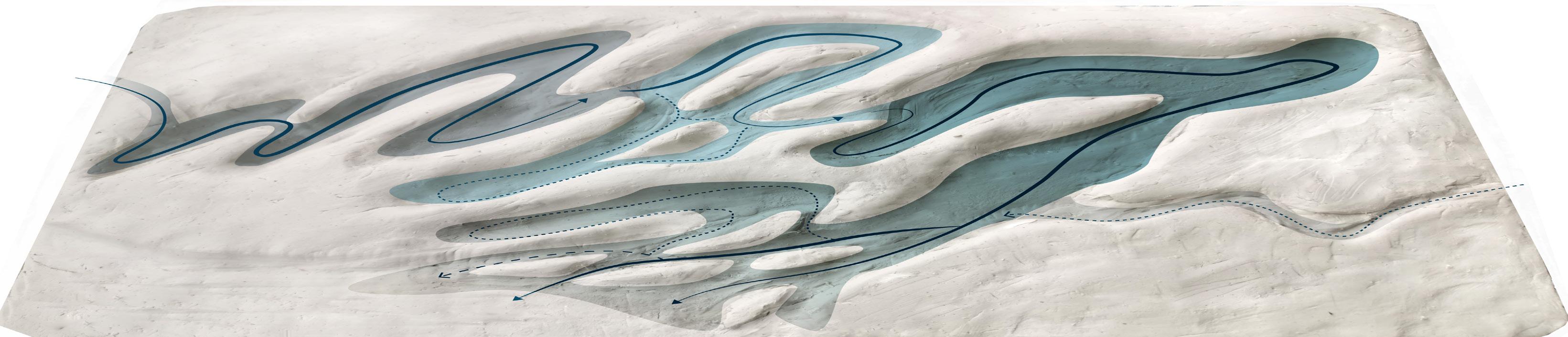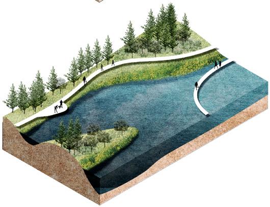The wetland design starts from the process of natural purification of sewage and designs the landscape topography. The wastewater first flows out of the sewage treatment plant, enters a sedimentation tank for settling, filters through the flow suppression inlet, and then flows through surface flow wetlands and submerged wetlands, where it is purified by plants and soil. After that, it flows the monumental landscape of open water, and finally diverts through ecological islands to merge into the Guan river.