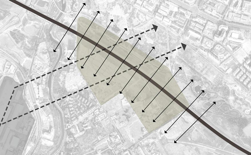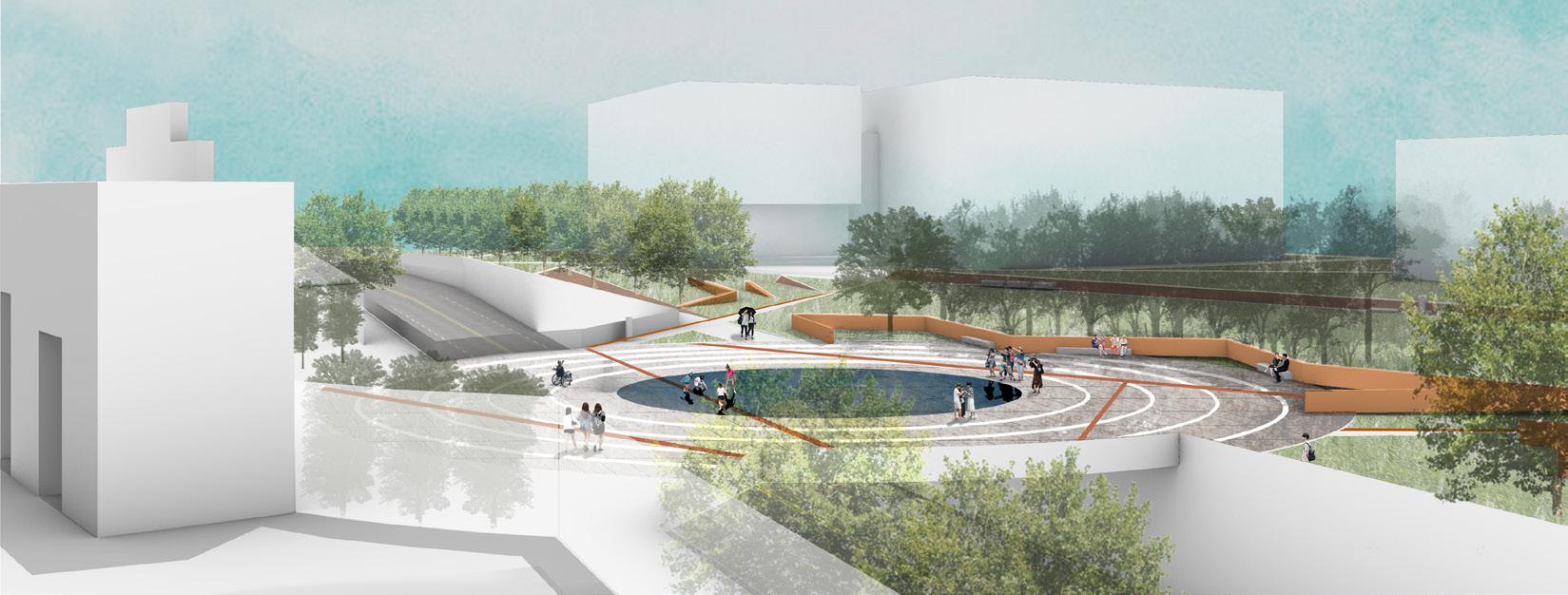 Pedestrians follow the terrain uphill from the park entrance connected to the subway station, feeling the axis of the space.