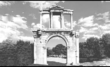 The Arch of Hadrian is a monumental gateway resembling a Roman triumphal arch. It spanned an ancient road from the center of Athens.