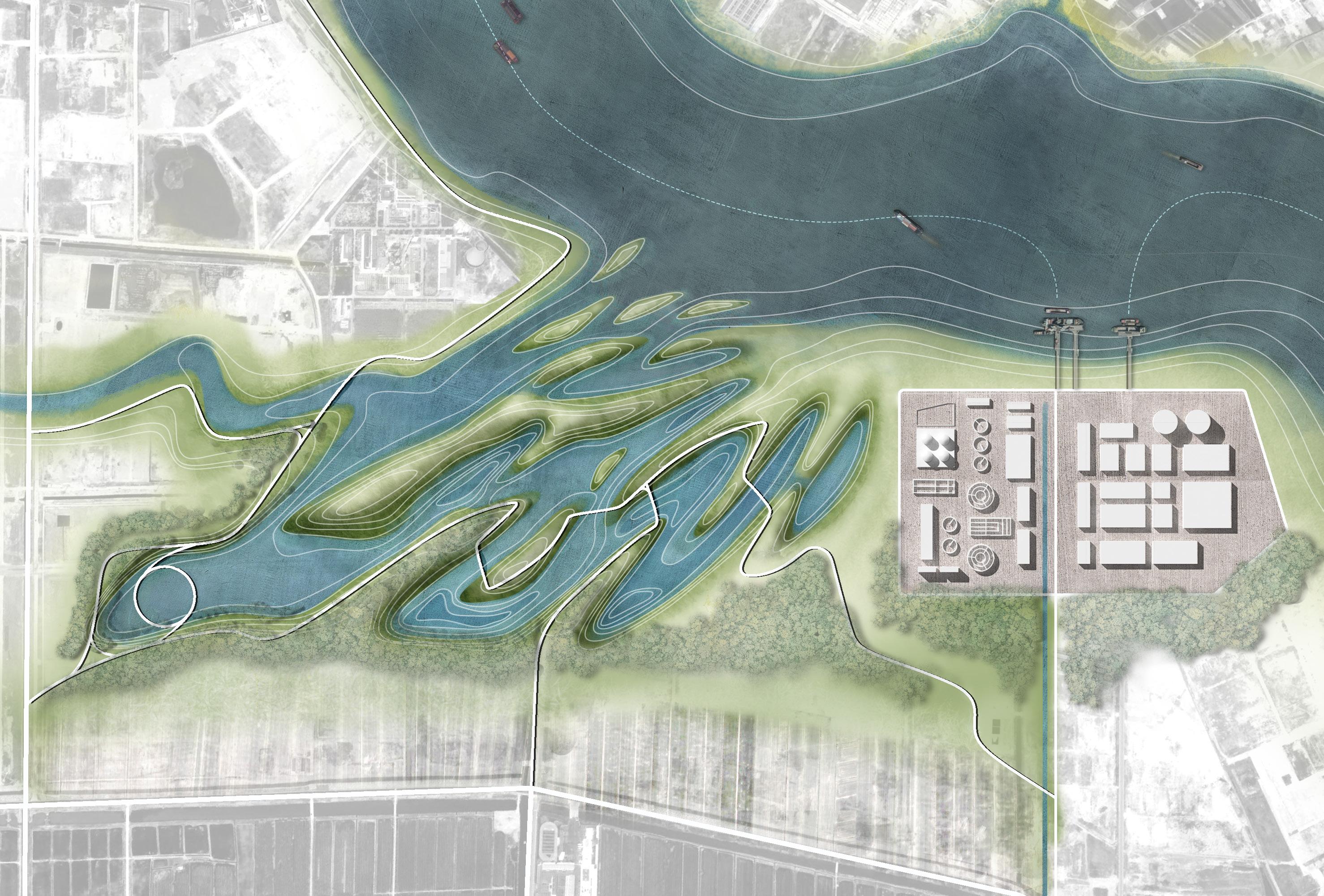 The design tries to heal the wounds of the chemical park - severe water pollution and explosion accidents. Through the addition and arrangement of sewage plants, the design of protective belts and wetlands, and the adjustment of the layout of towns, farmland, and industrial areas; in order to achieve sustainable development of the local environment and economy, and to achieve the purpose of education and warning.
