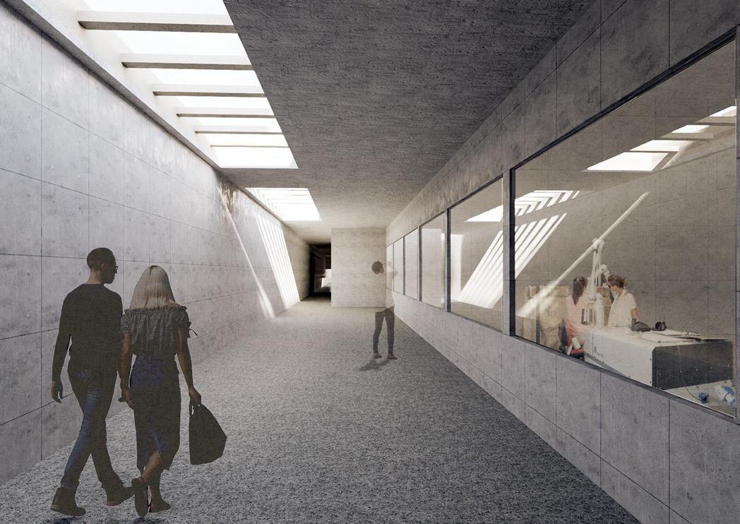 The building's skylight creates a visual connection to the landscape at the surface, providing a visual contrast between the past and present, and offering visitors a new perspective. The new building quietly blends into its environment, developing amidst the ancient traces buried to this day, revealing the archaeological history of the site.