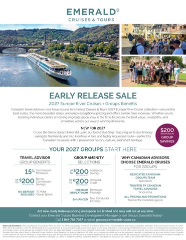 Act now, Early Release pricing and space are limited and may sell out at any time. Contact your Emerald Cruises Business Development Manager or our Groups Specialist today! Call 1 844 788 7987 or email groups@emeraldcruises.ca