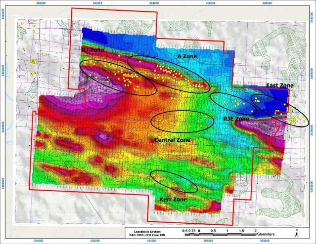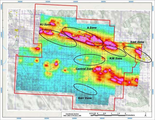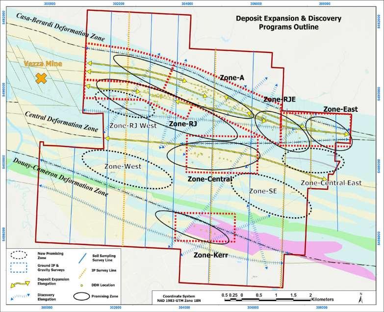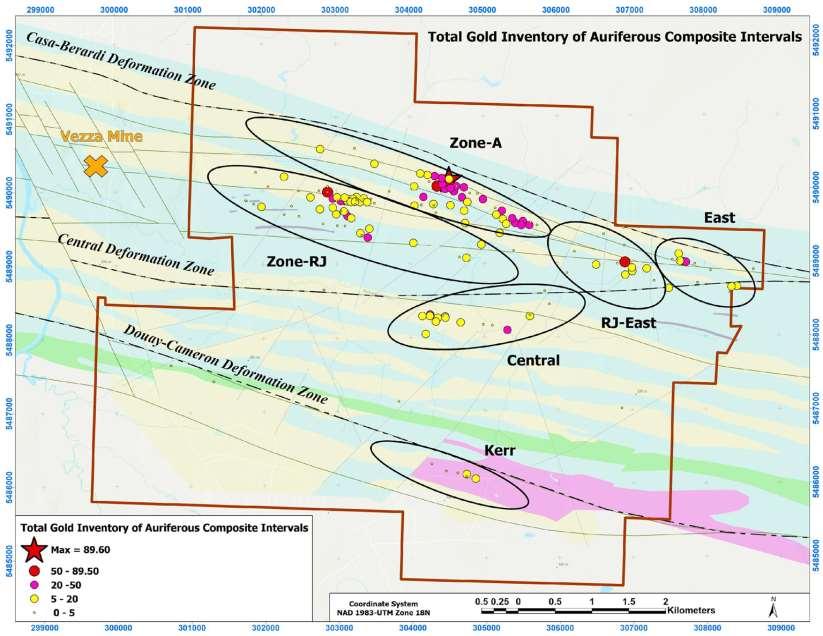 • Six known zones of gold mineralization; two principal zones of gold mineralization are the RJ and A zones, both of which are within the potential capture radius of the Vezza headframe. All six of the zones remain open for expansion, either at depth or along strike