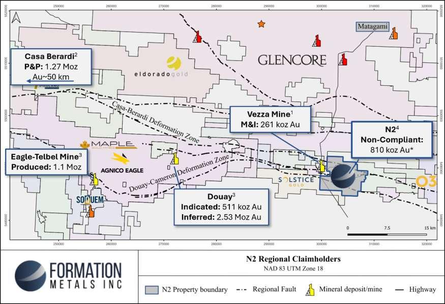 • 1.5 km east of the Vezza gold mine; ~120 km east of the Casa Berardi gold mine (P&P 1.3 Moz Au)