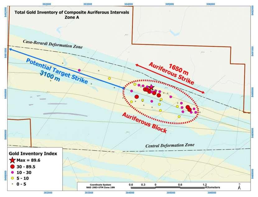 The “A’ zone, which comprises the largest historical resource, 522,900 oz @ 1.52 g/t Au, has had ~15 km drilled over 1.65 km of strike with 3.1+ km remaining to be tested; open at depth.