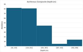 84% of drillholes intercepted auriferous intervals, with 11 intercepting >30 g*m Au up to a metal factor of 94 over a 56.6 metre composite starting at 18 metres depth.