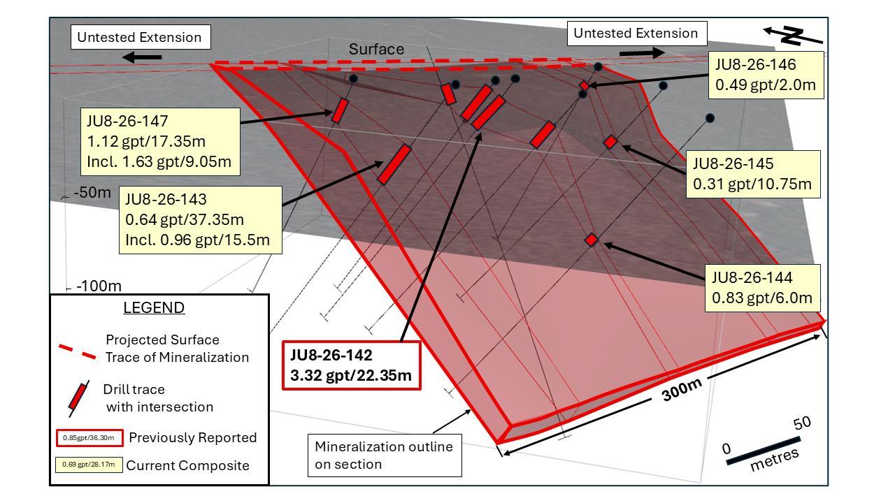 The drill results, grades, and interceptions disclosed herein for the Juby Gold Project and Tyranite properties are from prior exploration programs and have not been verified by a qualified person under NI 43-101 These results are historical in nature, are not current, and should not be relied upon as indicative of future exploration success or as current mineral resources or reserves Further, the grades and interceptions presented may not reflect the potential for economic extraction and are presented for illustrative purposes only Additional exploration work, including verification drilling, sampling, and independent analysis by a qualified person, will be required to verify these results and bring them into compliance with NI 43-101