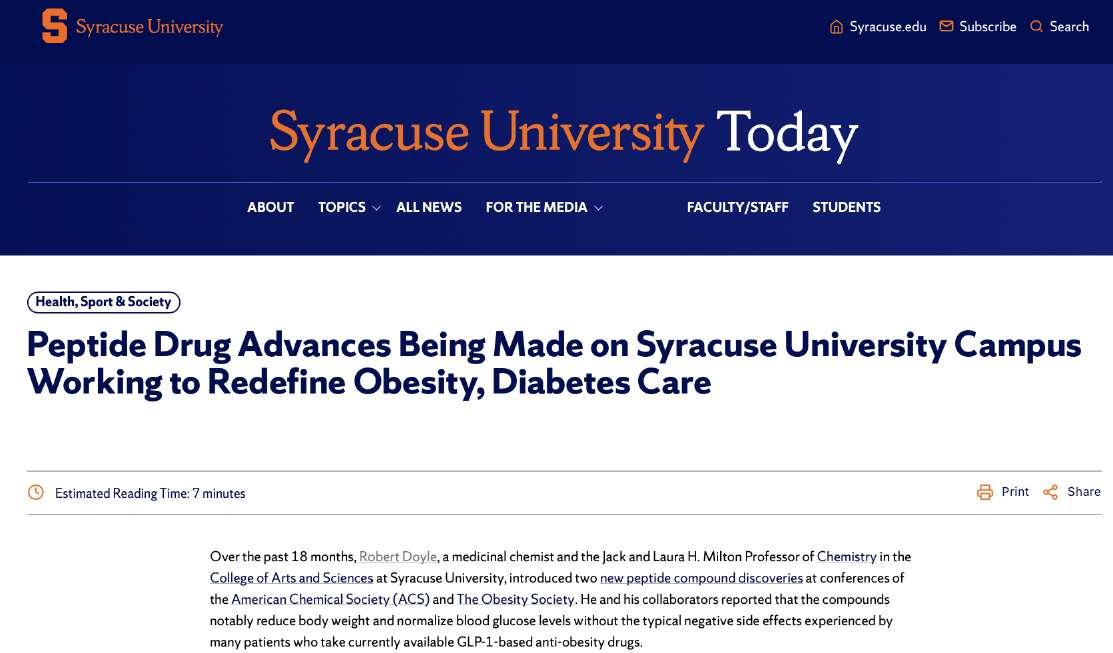 ๏ PRECLINICAL EFFICACY AS TOP CONTENDER: Preclinical studies have demonstrated its equivalent efficacy to Ozempic® in achieving weight loss and glucose control, with the added benefit of improved tolerability. Syracuse University work funding has been provided by the National Institute of Health (NIH) and other USA entities