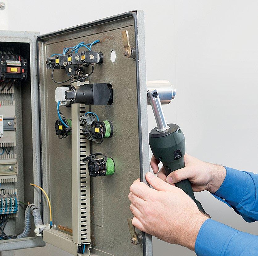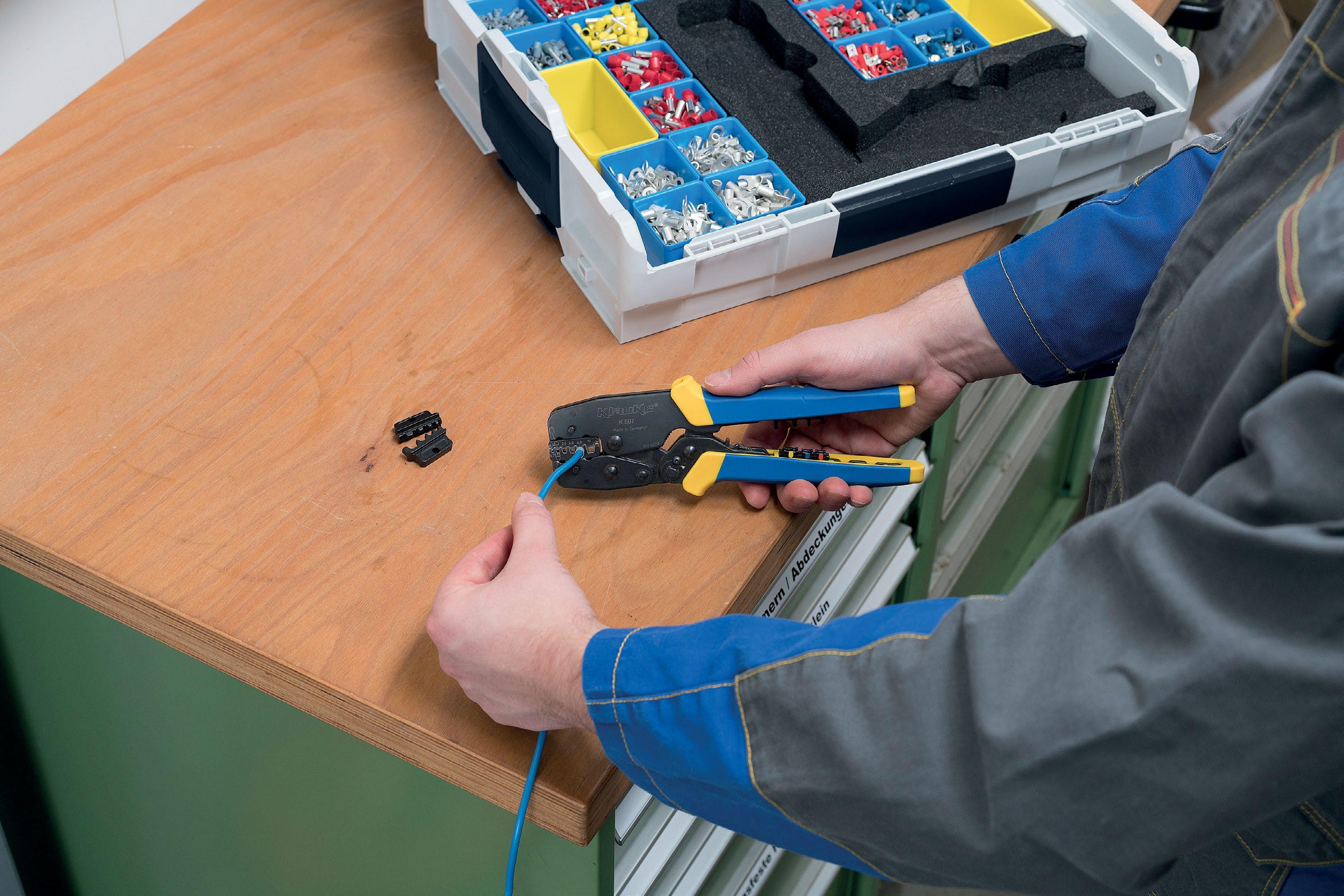 Im Schaltschrankbau kommen zeitgleich meist verschiedene Leiter, Kabelschuhe und Aderendhülsen zum Einsatz. Beim Verpressen müssen deshalb häufig die benötigten Presseinsätze gewechselt werden. Das kostet Zeit und Aufwand.