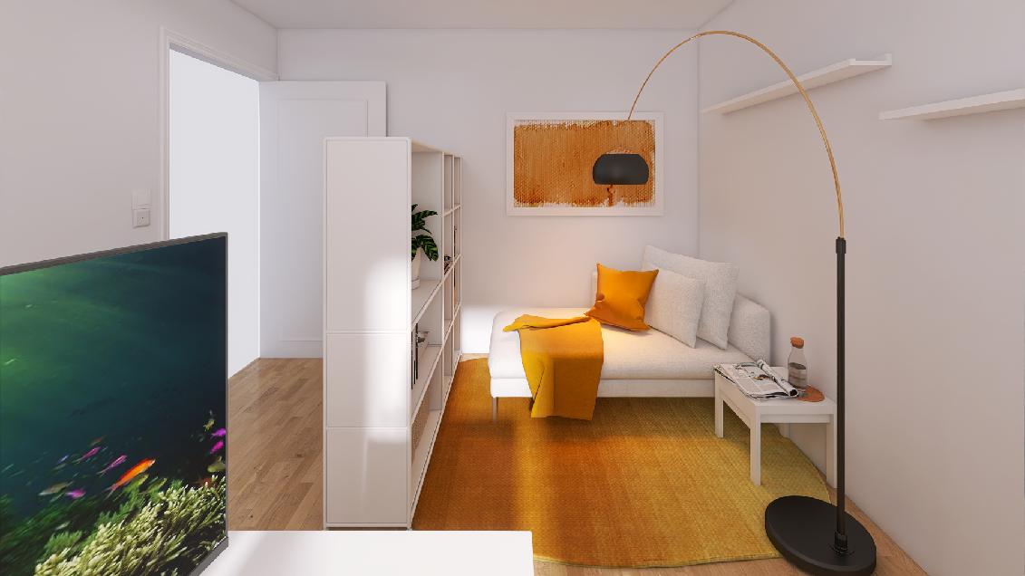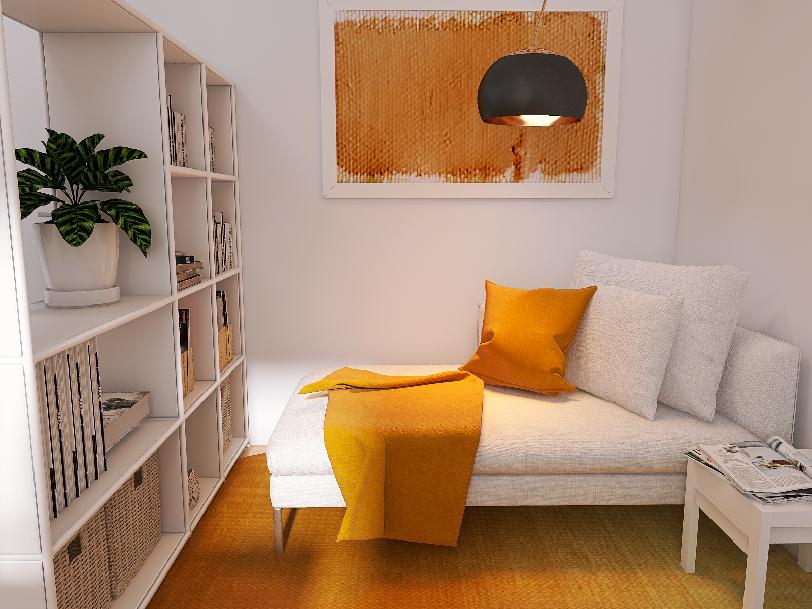 The colour palette was inspired by all the bright colours my client wears - specifically her bright yellow coat - her love for sunny warm days at the beach and warm sunsets. Choosing white furniture will help to enhance the natural light that enters the room from the garden and to optically widen it while keeping the whole feeling of it very minimal, yet cozy.