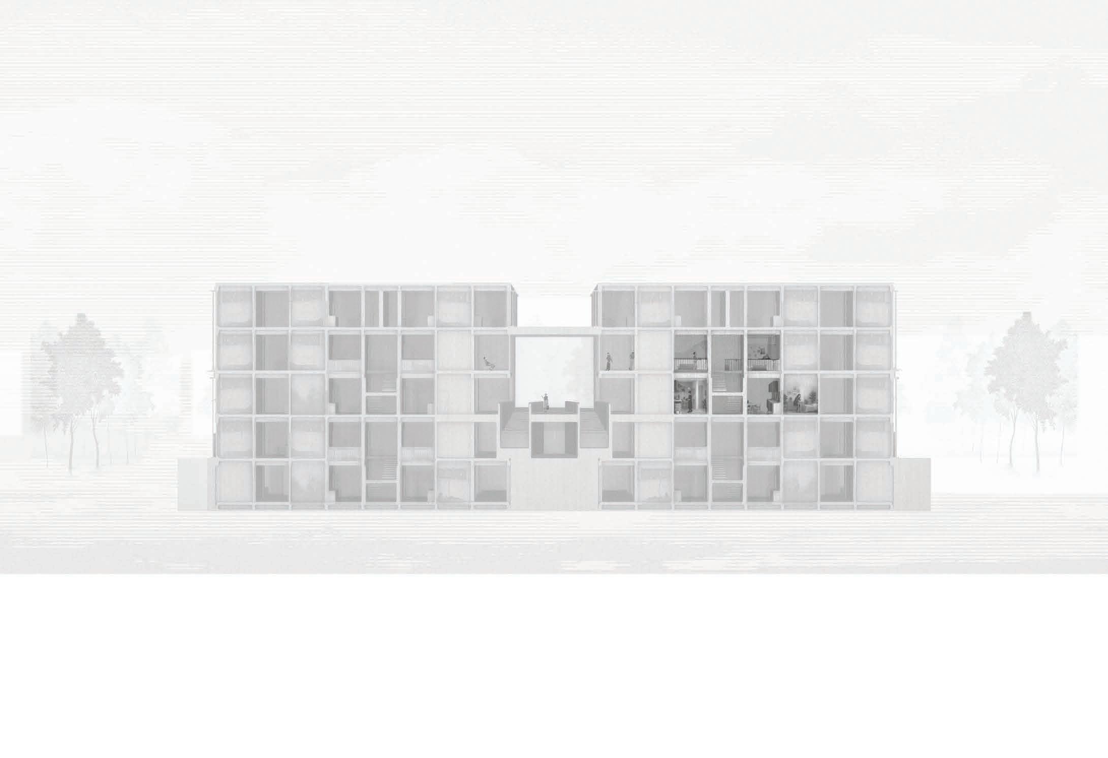 One of the defining features of the design is its dynamic sectional composition. By breaking the ground plane, the building introduces multi-level living arrangements, creating a sense of openness and spatial layering within each dwelling. The central living areas extend into double-height spaces, fostering a communal atmosphere while maintaining private retreats within the units.