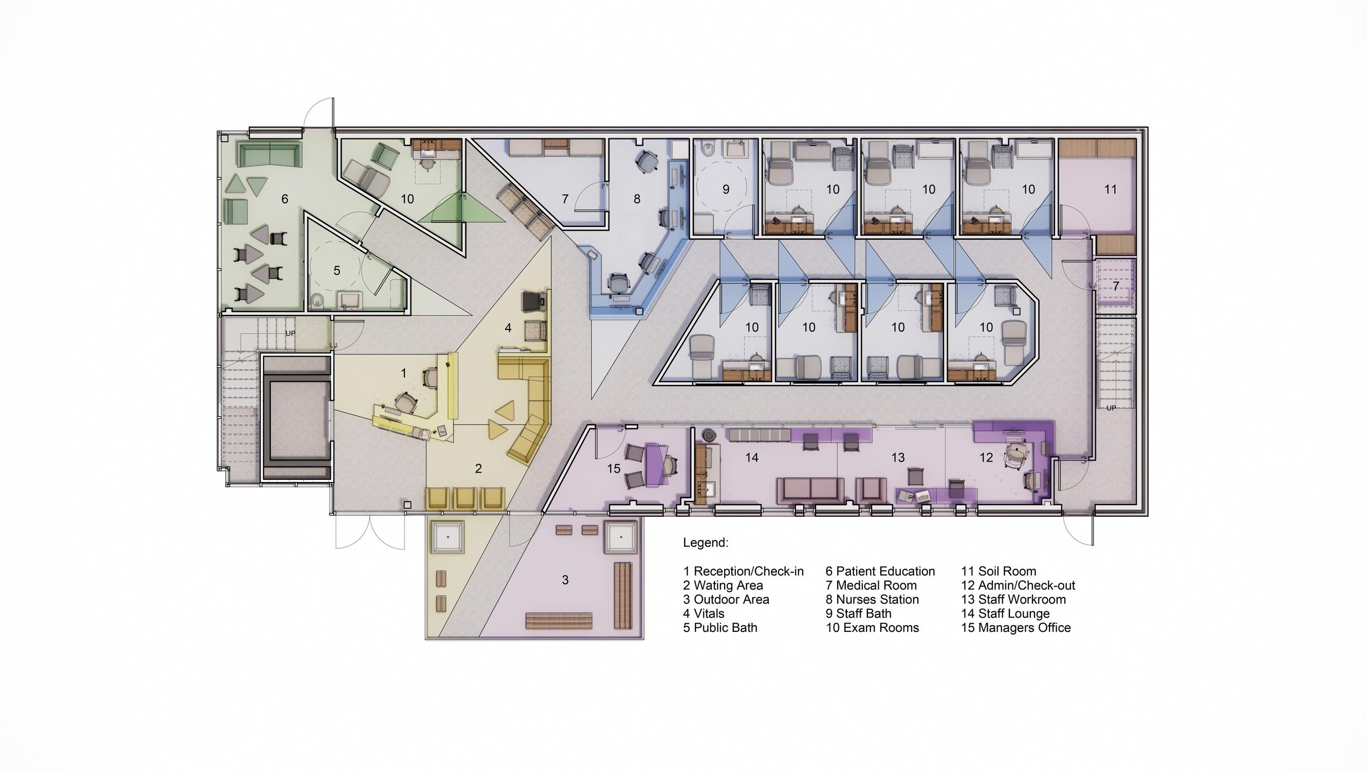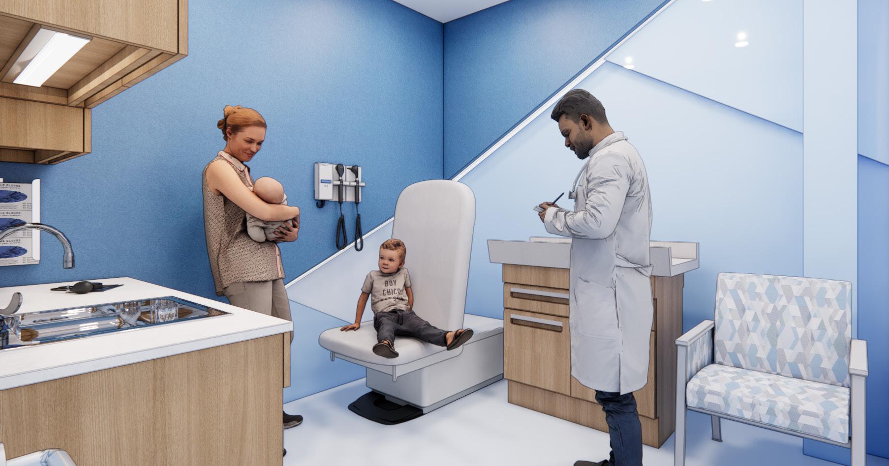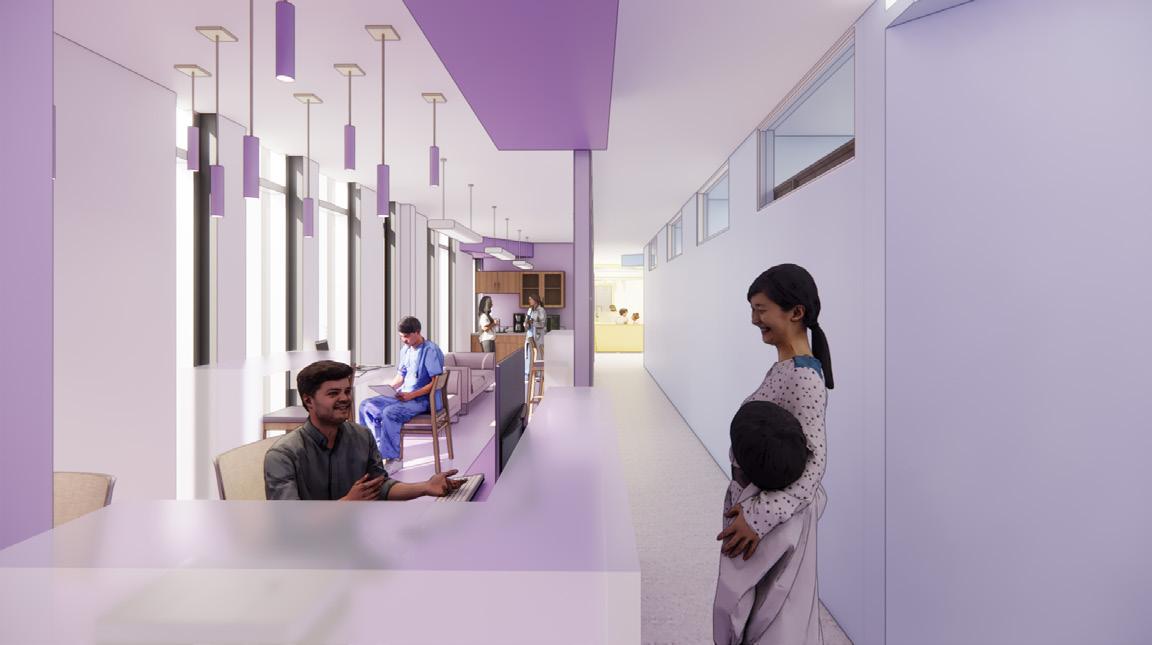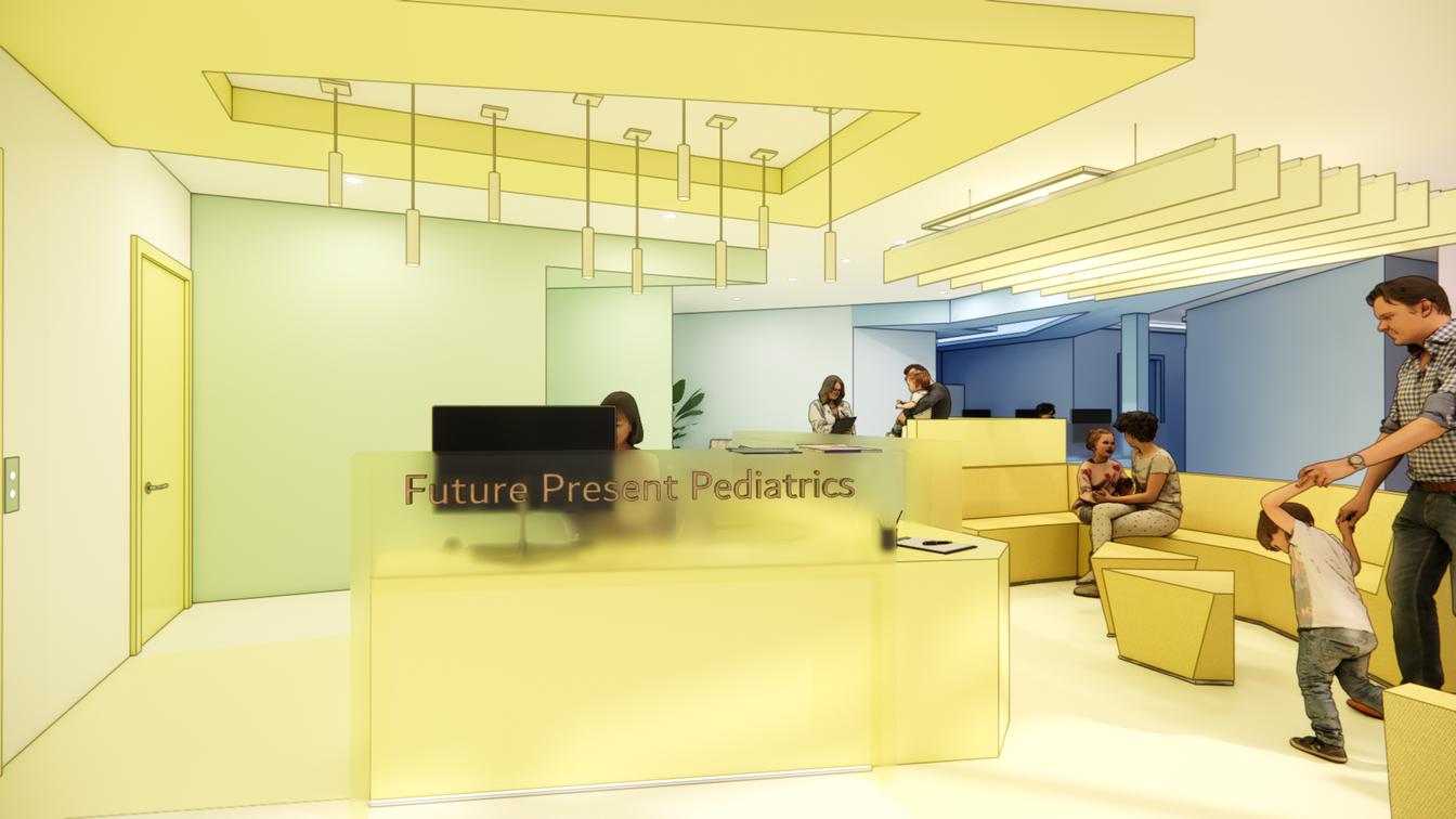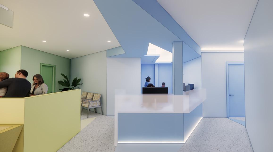 This pediatric primary care facility is a vibrant, enduring space that nurtures health, happiness, and inclusivity for children (0-18) and their families. Featuring a bold color palette, geometric forms, and clear spatial delineations for intuitive circulation, it fosters joy, confidence, and trust. The design integrates sustainable materials for lasting impact while strengthening community relationships. Thoughtfully designed spaces support healing, seamless interactions, and an optimized patient experi ence, ensuring families feel welcomed and empowered through engaging designs.