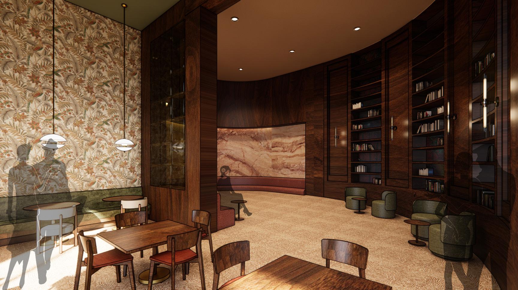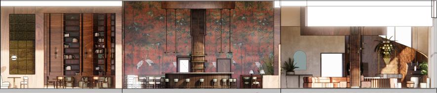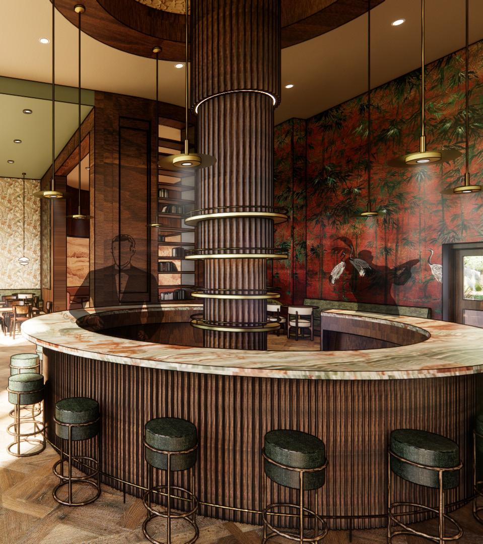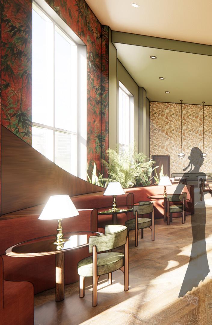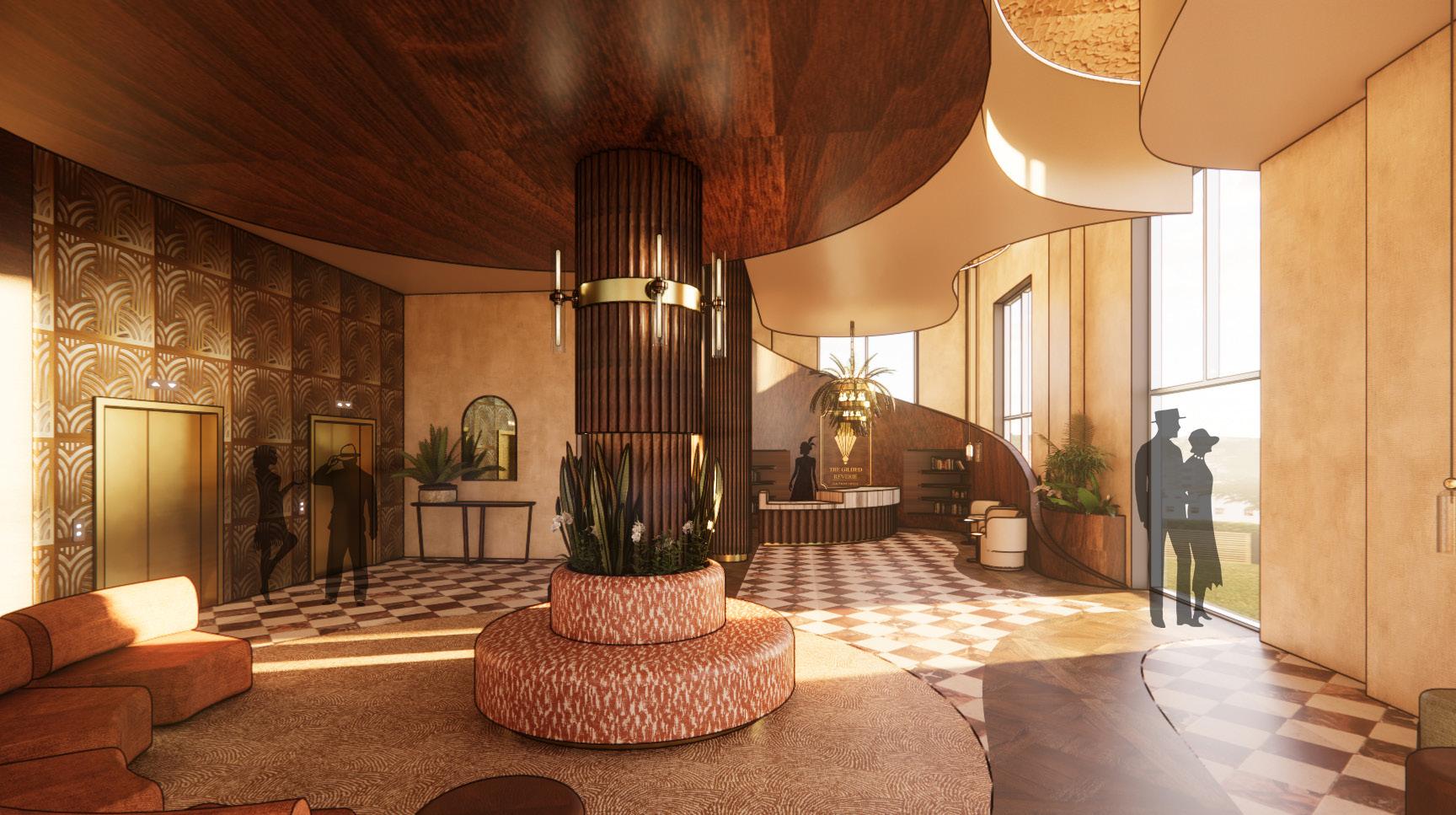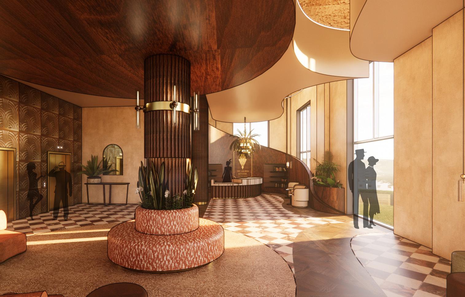 This hotel lobby is designed to spark curiosity and anticipation. Inspired by Midnight in Paris, it blends nostalgia and richness to create a timeless, welcoming atmosphere. A palette of deep browns, soft greens, and warm tones sets the mood, while Parisian streetlamp–inspired lighting adds depth. Materials like aged brass, velvet, stone, and rich woods bring character, while feather-like curves guide guests through the space. More than comfort, the design encourages reflection, connection, and discovery, inviting guests to slow down and engage meaningfully.