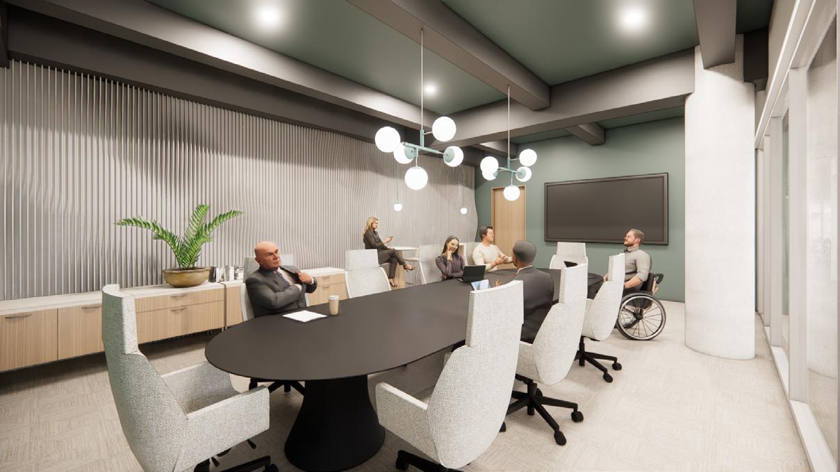 This large conference room offers a refined, collaborative setting with modern lighting, comfortable seating, and integrated technology to support inclusive meetings and execu-