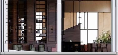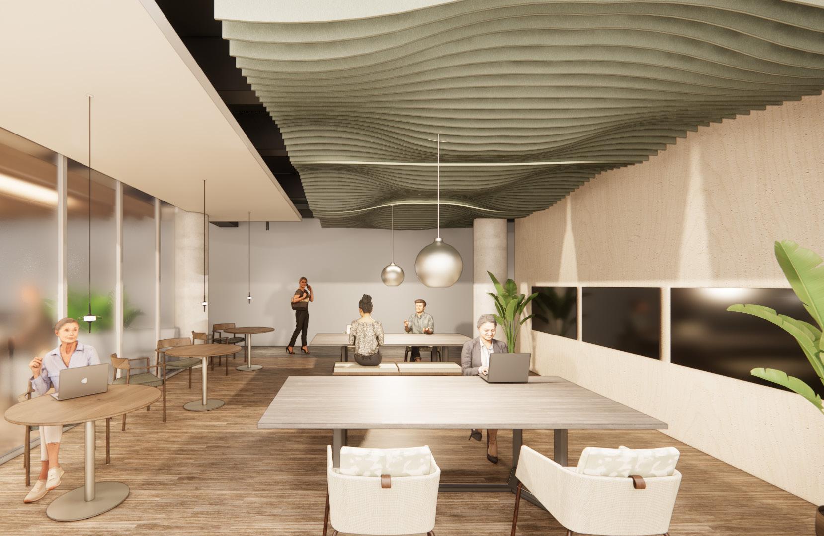 This workcafé space blends warm materials, soft lighting, and flexible seating to create an inviting environment for casual meetings, focused work, and social connection.